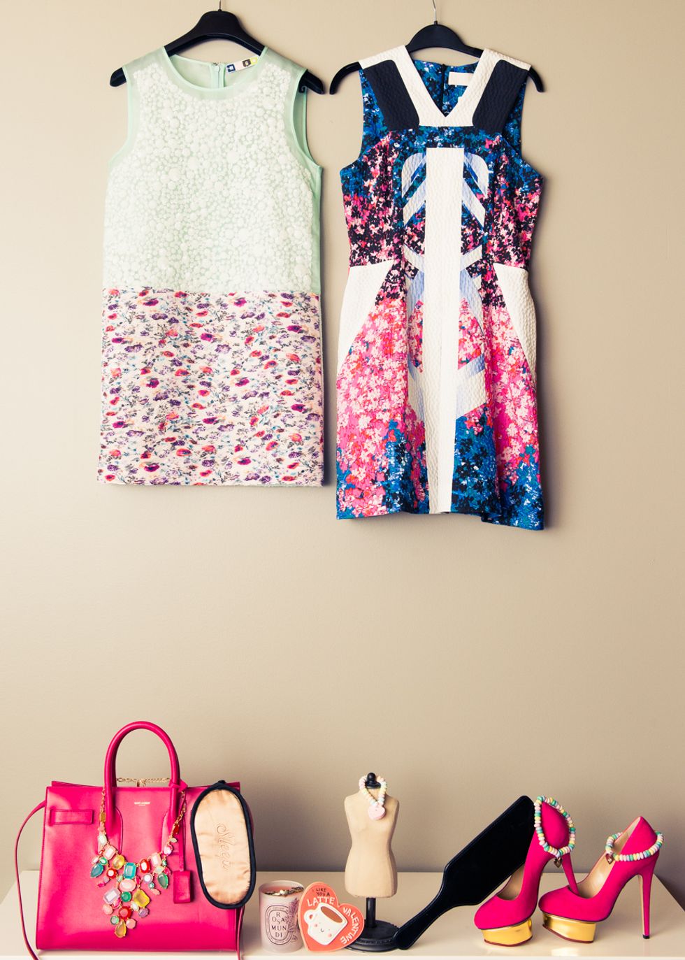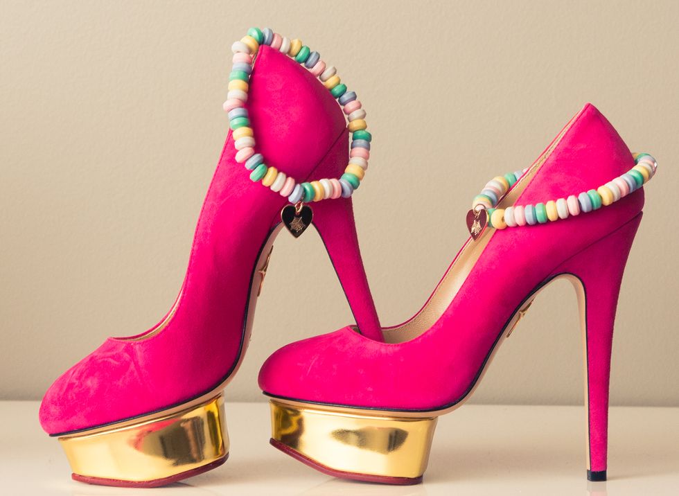 First up? In the spirit of whole-heartedly embracing that ubiquitous shade of cotton-candy-Carven-coat-pink that's everything we want to be swaddled in for the next six months, we're thinking pink. Enter magenta Charlotte Olympia platforms with little candy heart ankle-straps, a sturdy boss-lady Saint Laurent tote and bejewelled Manolo Blahnik flats. Oh, and a lacy little somethin' somethin' from Fleur du Mal.
