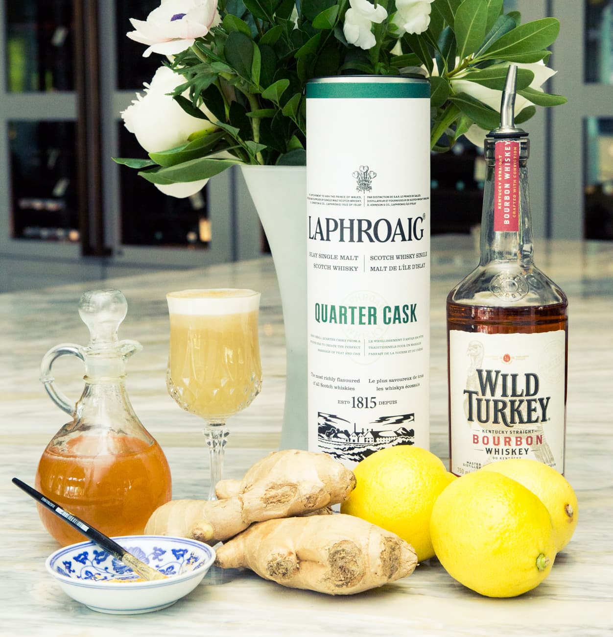 2. Add bourbon, scotch, lemon and ginger honey syrup.