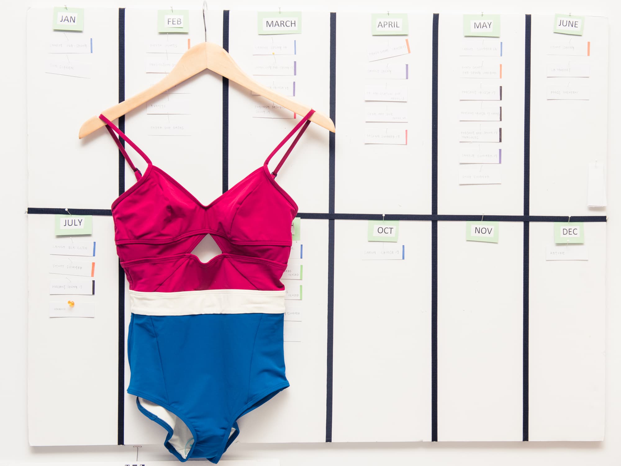 Jaime: “It definitely flipped a switch for us. We had to do so much research. We had to be Eres quality at least. And they’re amazing—their fabric is patented. Our fabric was a huge part of it, it’s from Italy and the color cuts are amazing. When we design things, we design them in colors. When we’re thinking about a shape, it’s always a color with another color. We’ve just never really gone for print. Part of our DNA has always been a minimalist aesthetic—we just want amazing colors. We wanted people to feel like they could wear this suit, that was going to last forever—that was a higher price point, but was amazing quality, and to have it be seasonless.