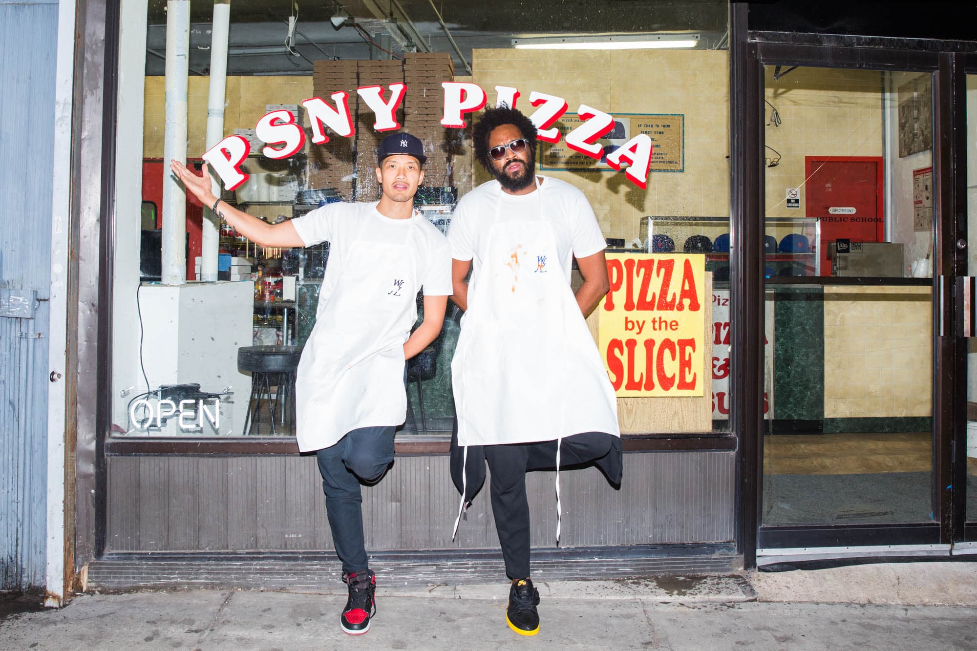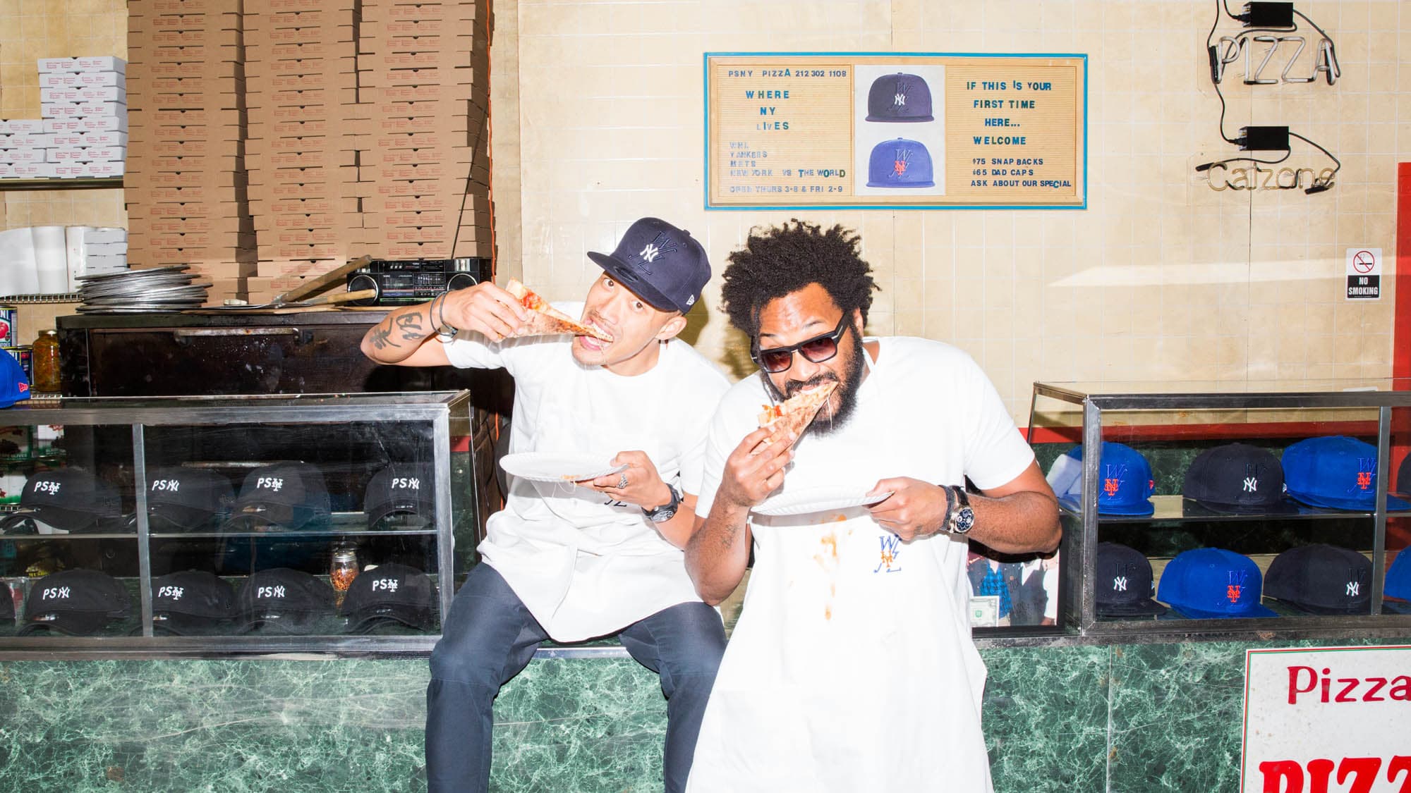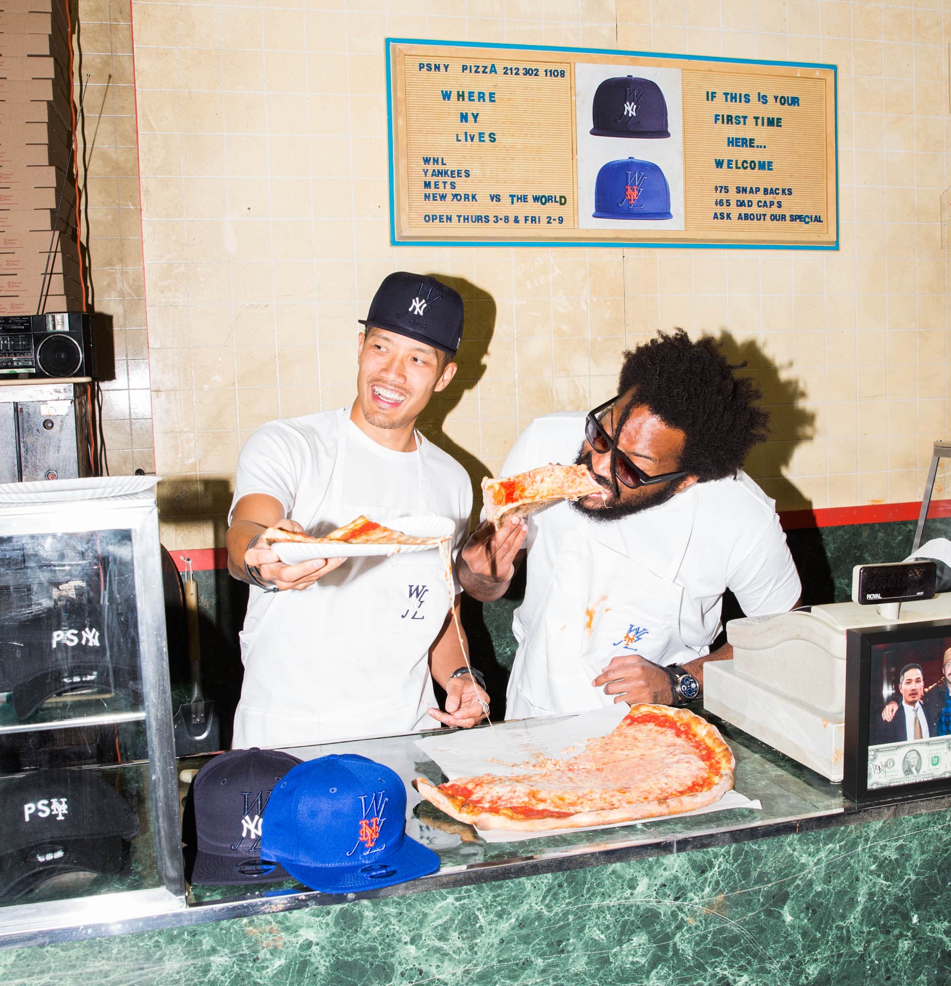When Dao-Yi Chow and Maxwell Osborne of Public School and DKNY ask you out for a slice, you go. You go just to get that high school, hanging out with the cool kids rush for the length of time it takes to inhale a slice of greasy New York pizza. If we’re being totally honest, though, sharing some ‘za with Dao and Max (as the cool kids know them) wasn’t exactly what we expected when we got an exclusive walk through of their two-day-only (!) pop up store for their new collaboration with New Era. Frankly, we expected the typical fashion pop up of empty gallery space hastily pulled together with racks of merch in the style of Kanye, for example, but that’s not exactly Public School’s style. Instead they retro-fitted a by-the-slice pizzeria next to the New Museum on Bowery and modeled it after Joe’s Pizza in which to serve up their Yankees and Mets hats today and tomorrow.