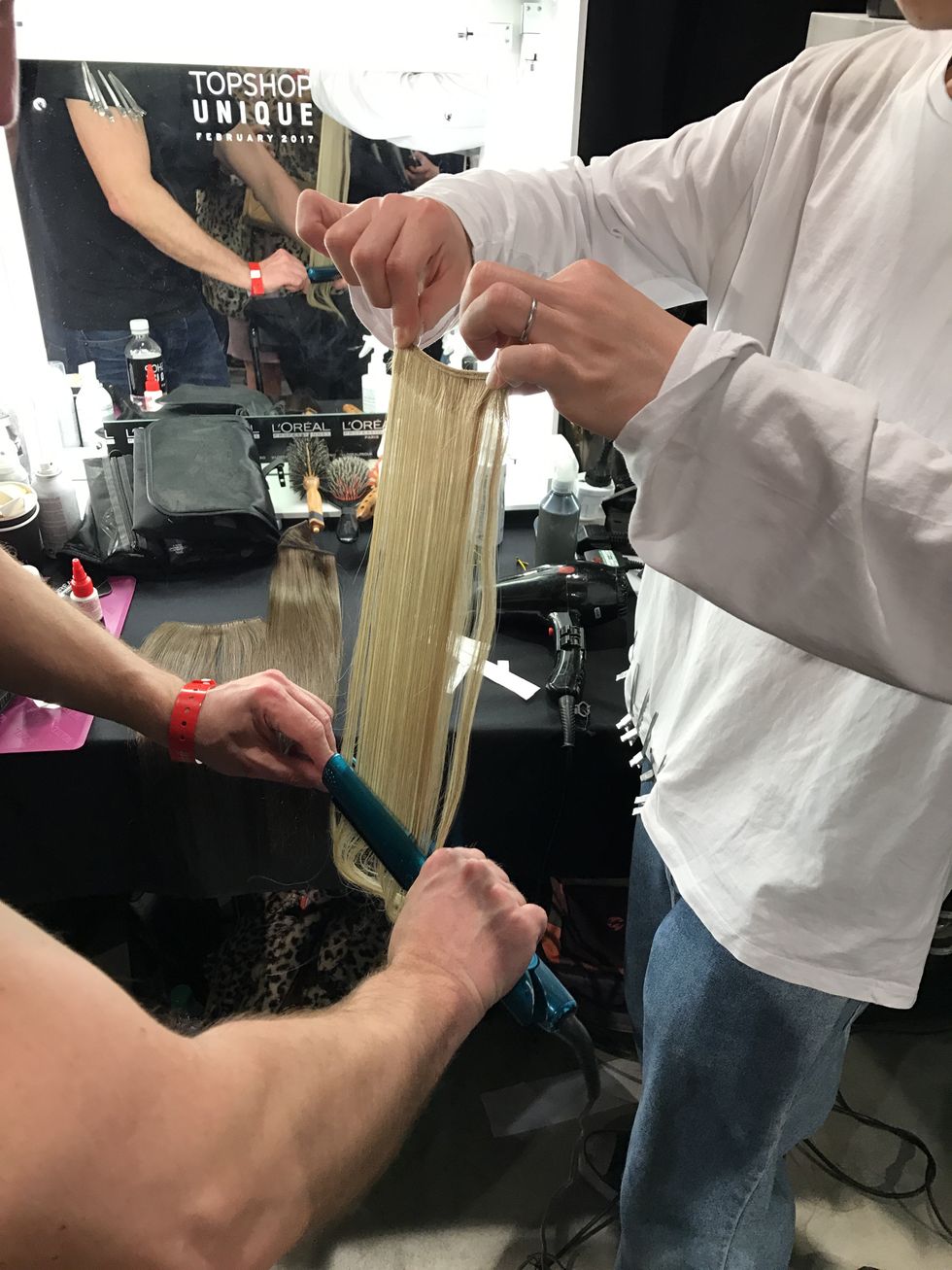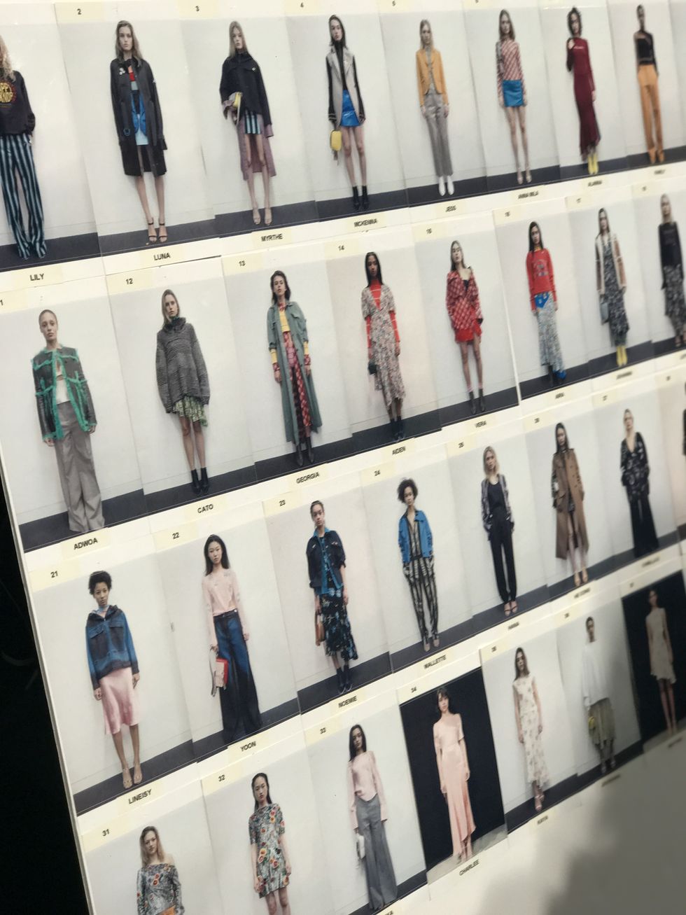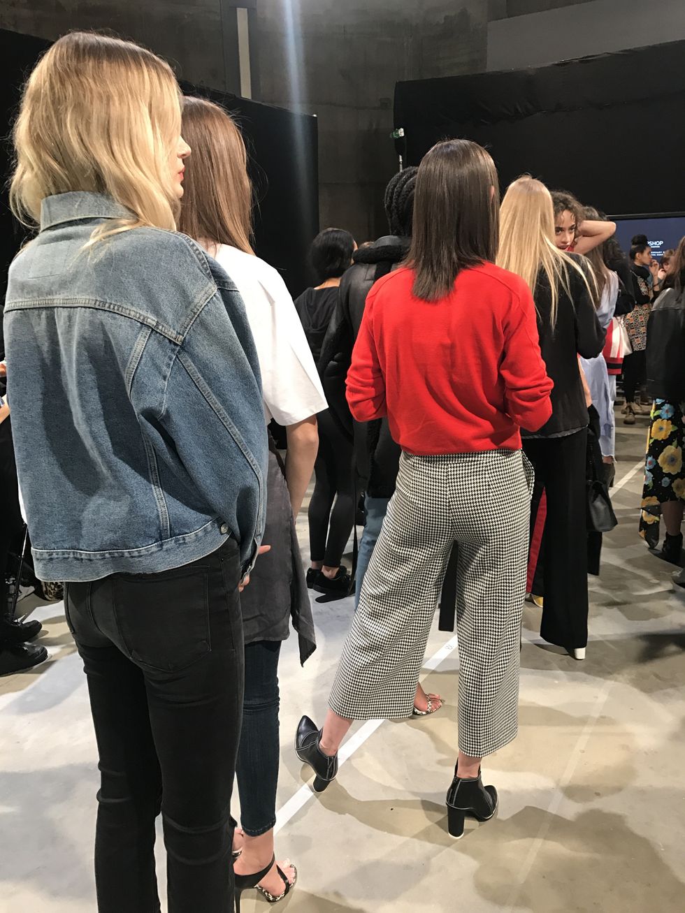 “After watching Roland Mouret’s return to London, I rushed to the Topshop Showspace, which is back again at the Tate Modern museum—a little issue with the car made me slightly late, but it was all good in the end! I arrived just when the models were doing the run through, a great moment to wander around backstage, check which products are being used and see the face charts for makeup. From this I gathered the following: red lips and lots of straightened hair extensions were to be used.”