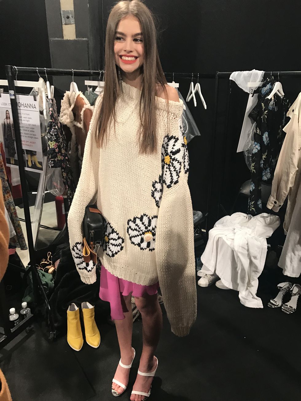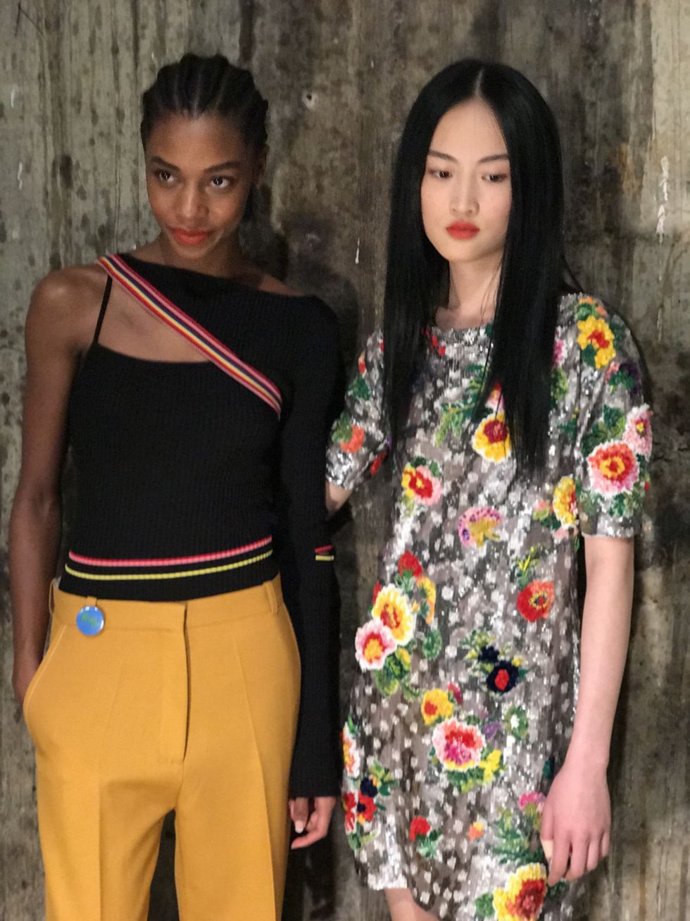 “From backstage to front row, the collection had a grungy vibe, including oversized pieces and some sexiness—especially seen with the final satin dresses and a real mix of textures. My favorite detail: pins customized with models names!”
