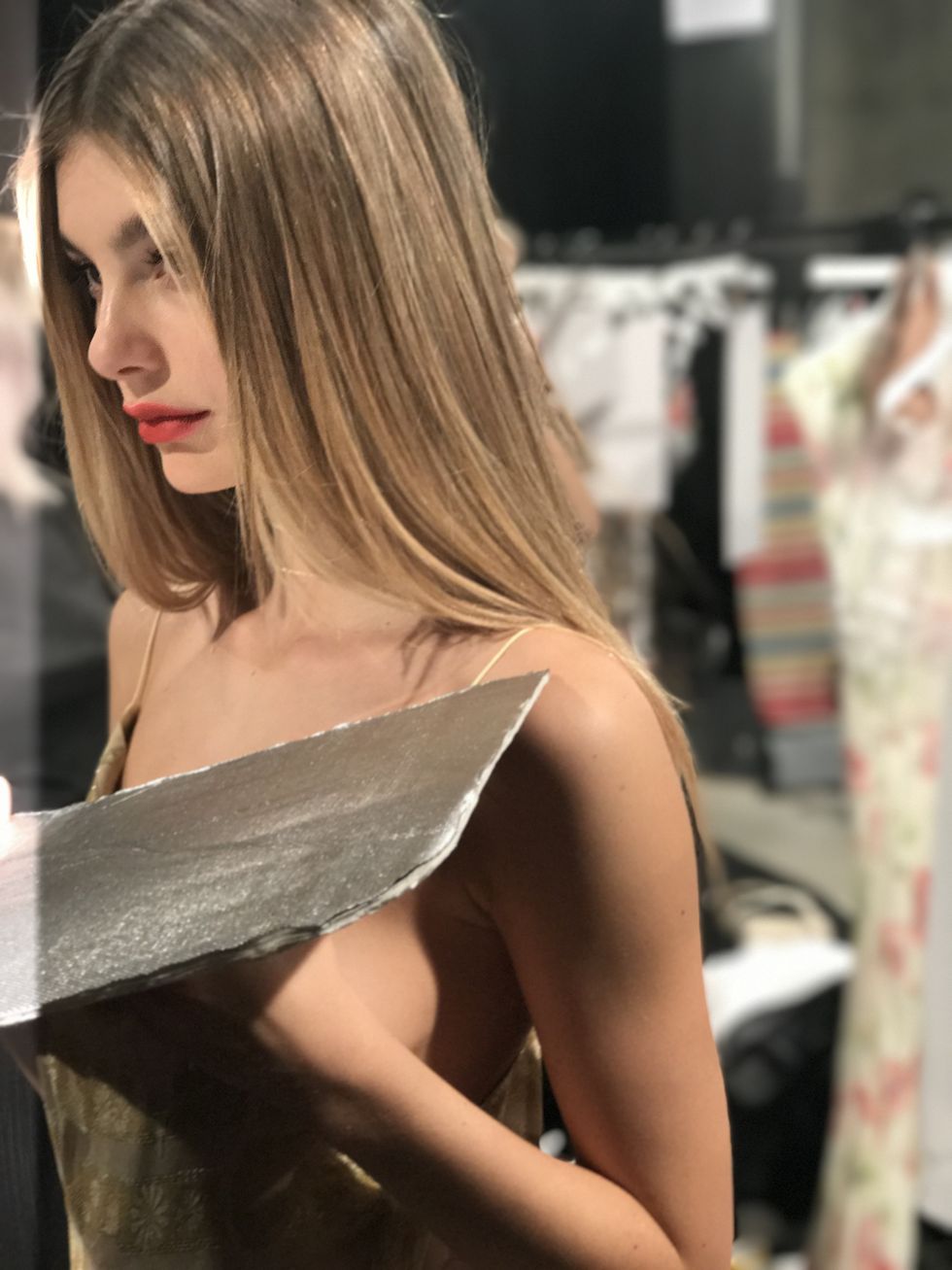 Back from watching the rehearsal, makeup artist Lynsey Alexander was ready to talk about the beauty looks of her first season heading the Topshop makeup team. “We went with this idea of leftover makeup, so all the elements have been done but broken down a little bit,” said Lynsey. “She’s got a lash, she’s got a lip, but it’s as if they applied it in the morning and this is maybe the day after. It’s this deconstructed beauty, with very sexy skin. Nothing too perfect, which is pretty hard for us to do as makeup artists, as we learn how to perfect! The lips are red but feathered out, to give the impression that she was kissing someone, and the lashes are clumpy.”