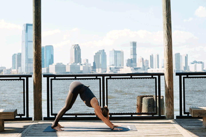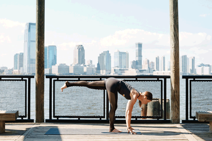 “Wild Thing is a natural boost to help energize your body and mind. Start in a side plank, ground down through your left hand, and start to lift your right leg to float on top of your left leg. Bend your right knee and ground the ball of your lifted foot behind you. Press the ball mound of your right foot down, and elevate your hips. Rotate the grounded left hand and shoulder to allow your heart to open.”