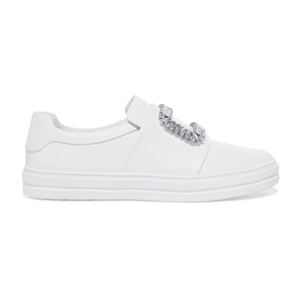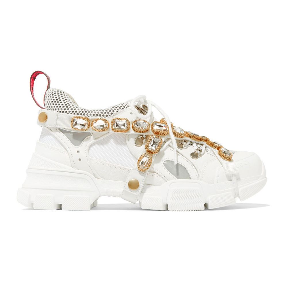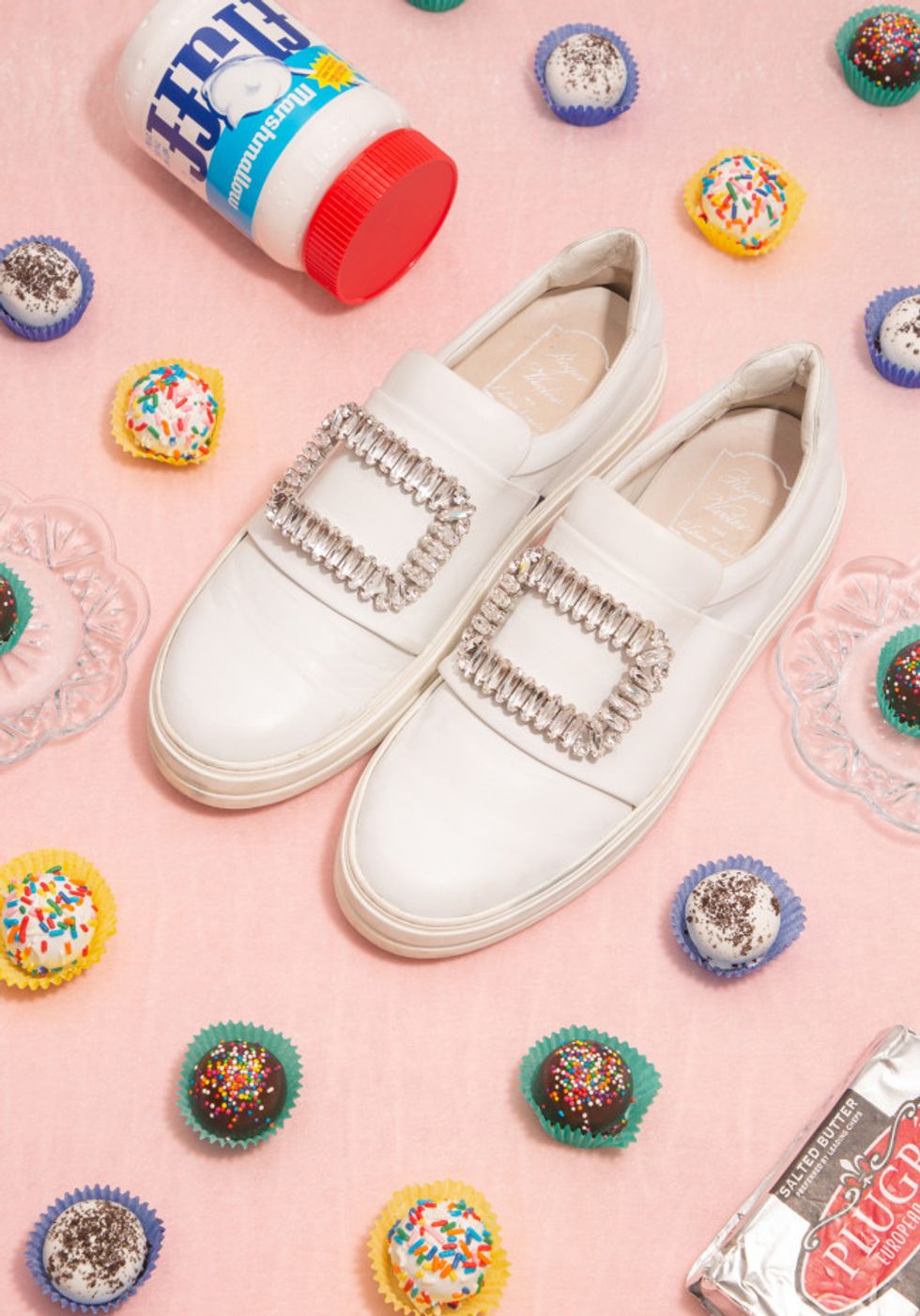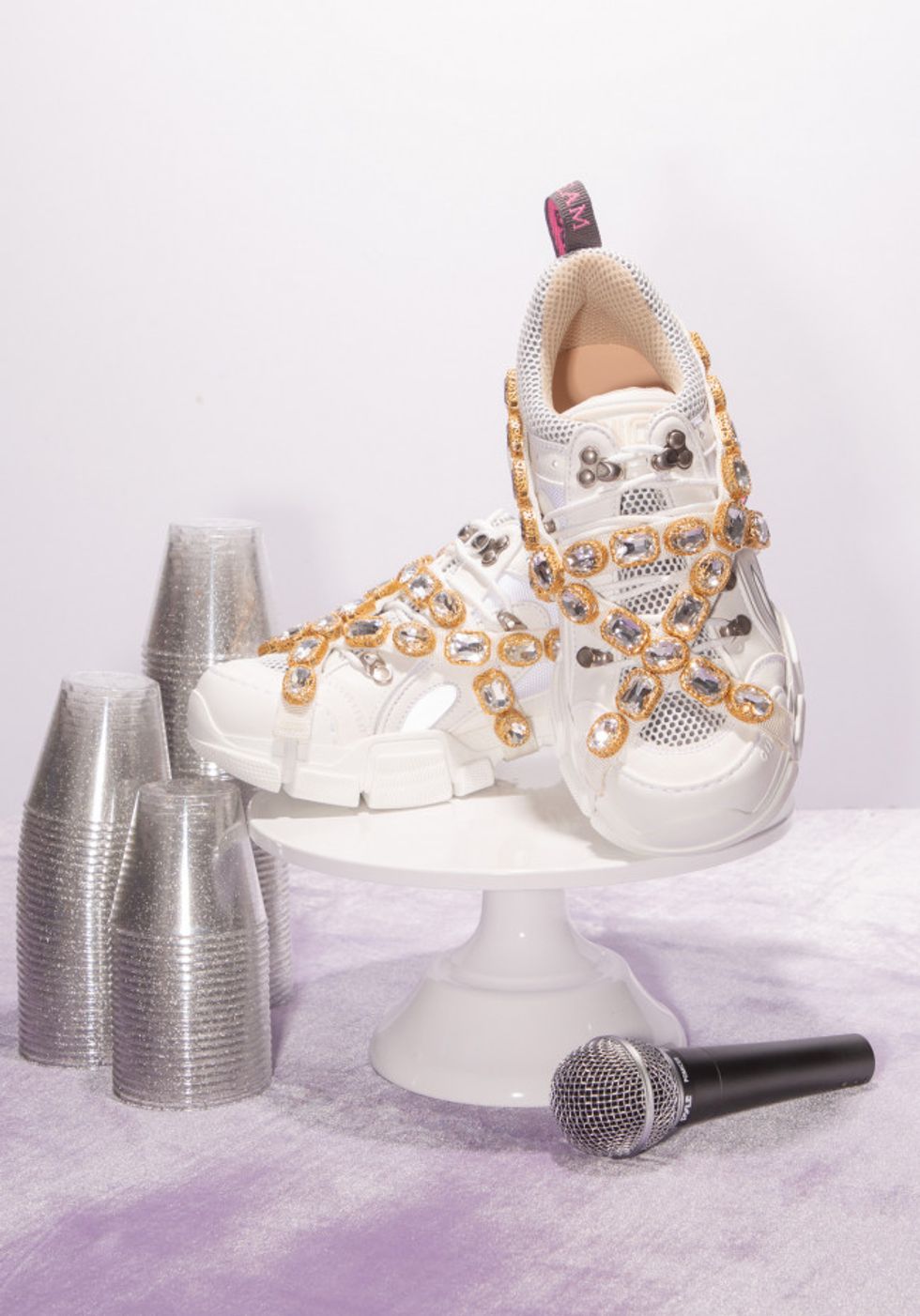 We like to believe crystals are healing for the sole. Whether it’s a heel or sneaker, a crystal-embellished shoe can elevate any look. Complete your outfit drippin’ in Area earrings and a Miu Miu bag to tote. Oh, and a giant glass of champagne. Cheers!