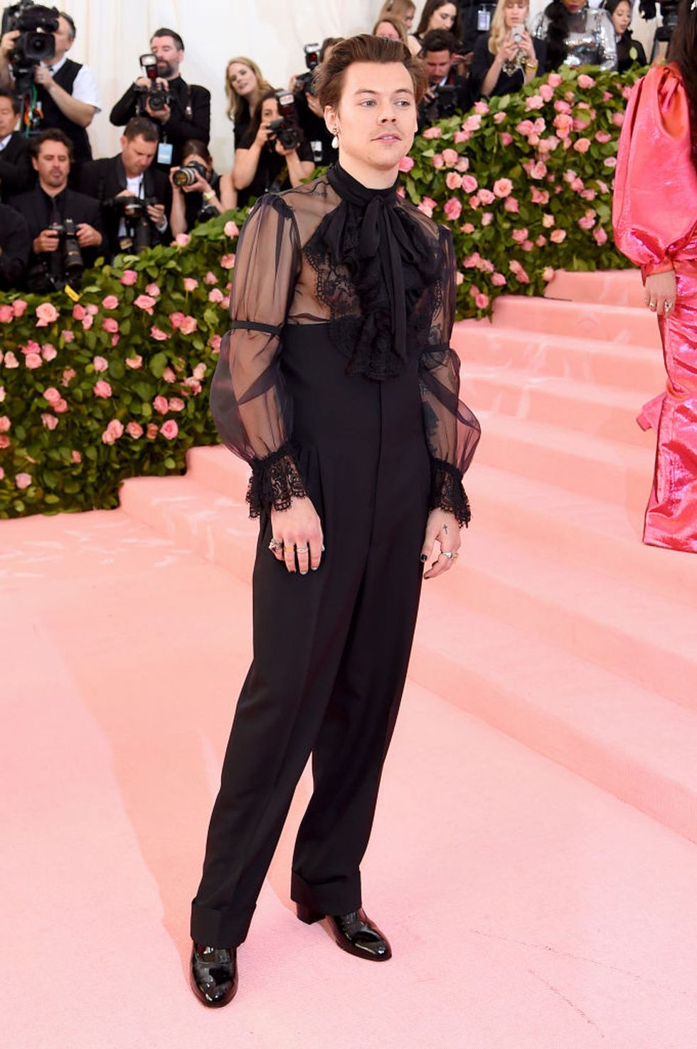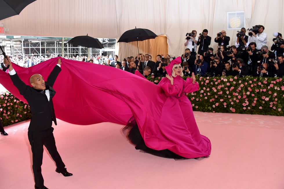 Some would argue that the Met Gala Camp-themed red carpet was shut down before it even truly started, thanks to this evening’s co-host, Lady Gaga, and her four (yes, four!) looks. She teamed up with designer Brandon Maxwell for a literal show, with the icing on the cake being her striking a few backbends on the famous Met steps in her final ensemble—a bra underwear, fishnets, and platforms.