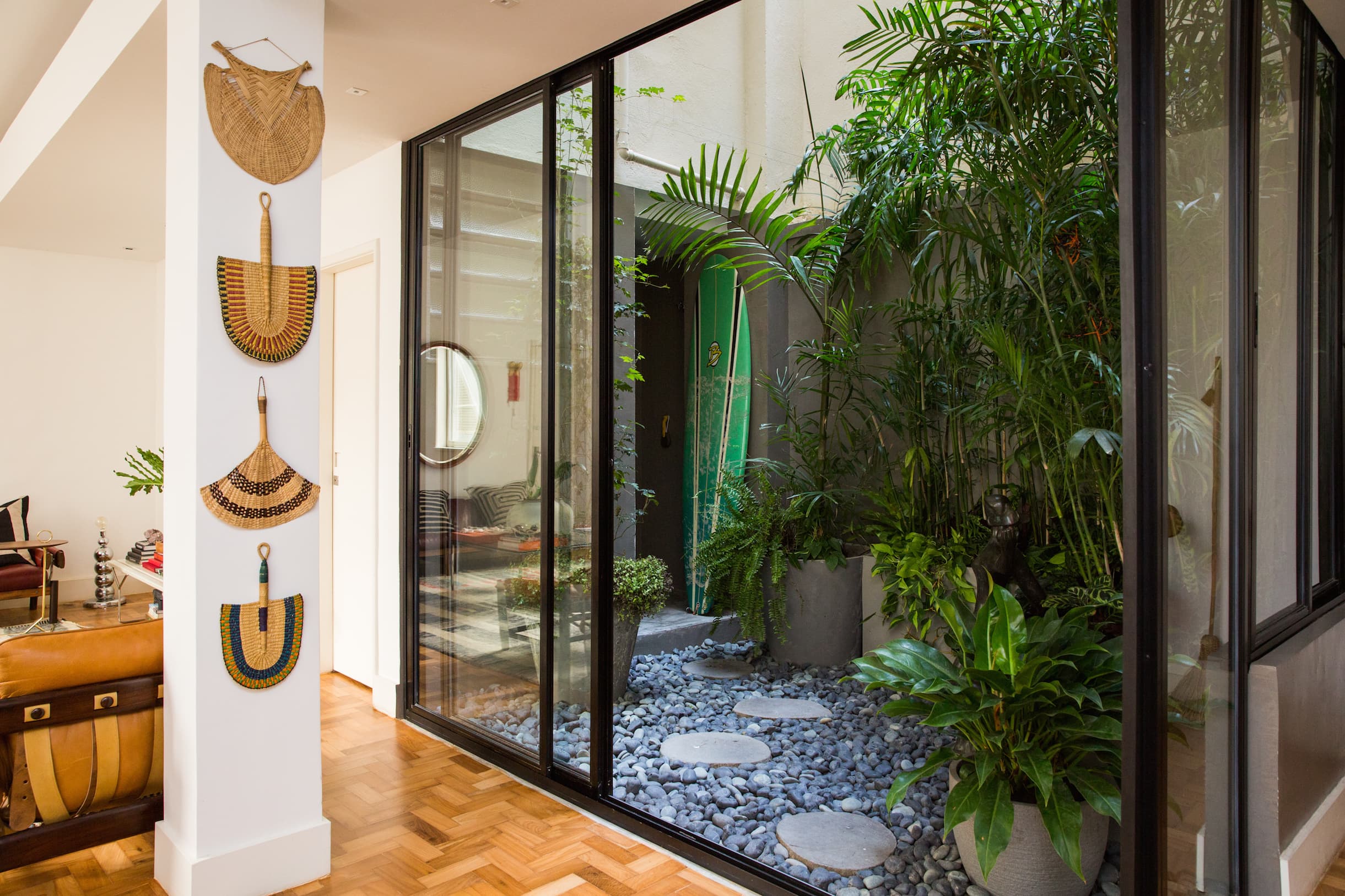 , has renovated the apartment, giving it a comfortable, modernist feel complete with impressive leather furniture and Moroccan rugs. The apartment, which is located in Rio’s Ipanema neighborhood, has a garden right smack in the middle. Floor-to-ceiling windows and sliding doors encapsulate palms and ferns, which at first glance almost appear to inhabit another room entirely until you notice the open sky above.