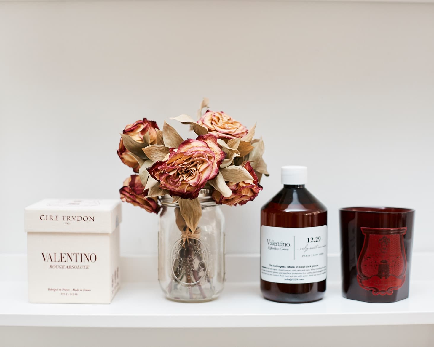 “When you first smell the scent, it’s all these different facets of the color red. We did that with geranium, which is right on top—it’s a rose note that’s mixed with mint. It has a little bit of a sparkle and a freshness to it, but still has a classic spicy, rose piece. And we used a variety of rose notes in the heart of the scent. Some of them quite classic, waxy, full and voluptuous. But it’s a little bit more petally, dewy, and easy because Valentino, even though it’s steeped in a lot of culture and history, is still modern and quite light. A lot of it is based off of couture and a couture dress for Valentino looks like it barely touches the body, but it is still perfectly structured, that structure has to come from somewhere. But, the lightness, that is what you see and that is the emotion you feel. So for the lightness we used peony and magnolia and all of these petally, dewey, light flowers. The other part of the scent is that it’s so red and passionate and so graceful in its wholeness. It’s when you really get into the back of the scent that you start getting into the history of Rome and the culture of the brand and that strength of construction. So you have a big, black, leather piece and it’s embraced by this very creamy, very sensual balsamic note. It makes the bottom of the scent quite profound. The contrast between the top and the bottom is the contrast you see throughout the whole Valentino brand.”