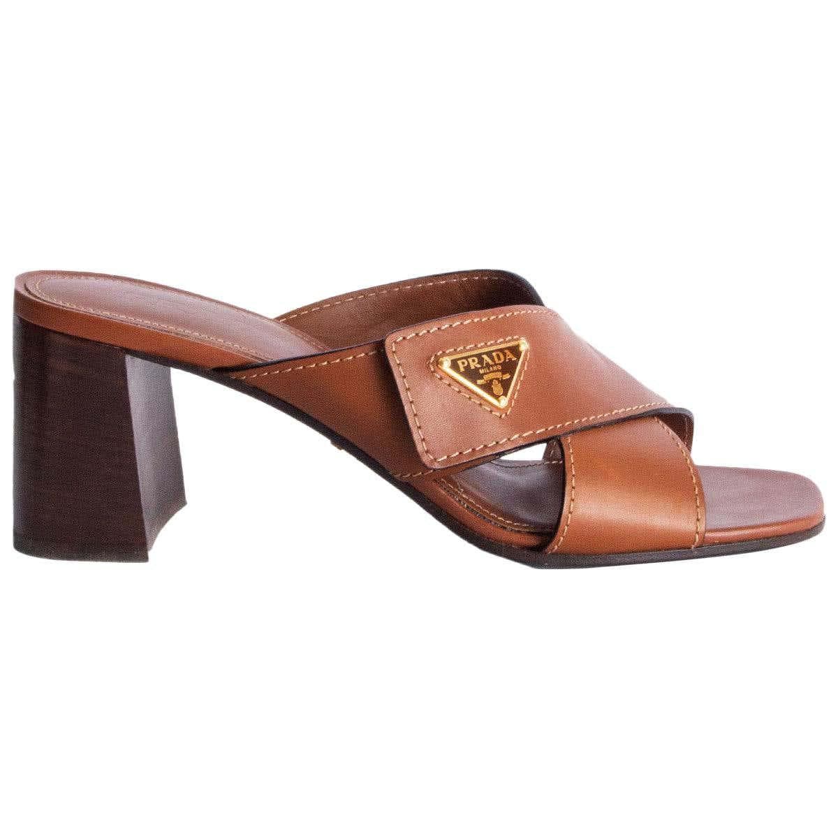 Cognac Brown Leather Criss Cross Block Heel Sandals
