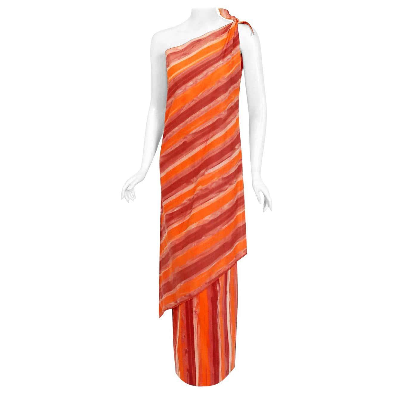 Vintage 1970's Striped Cotton One-shoulder Asymmetric Dress Set
