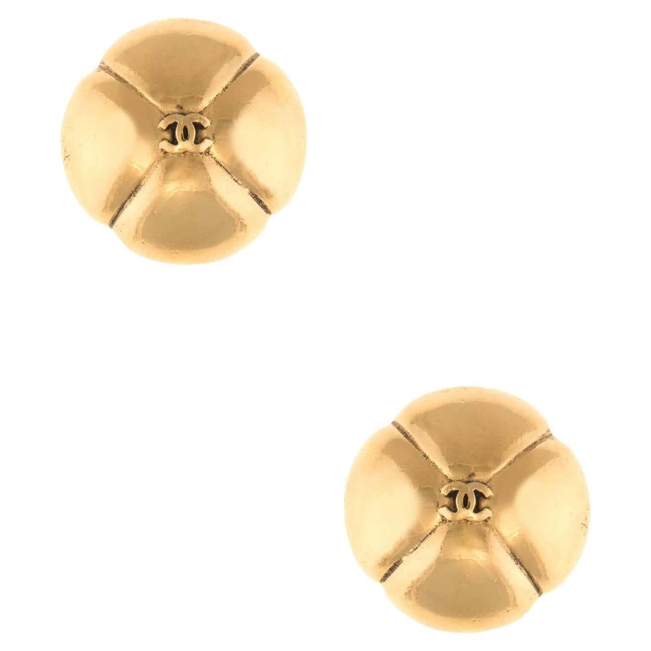 Vintage CC Logo Clip Earrings Yellow Gold Tone Domed Quilt