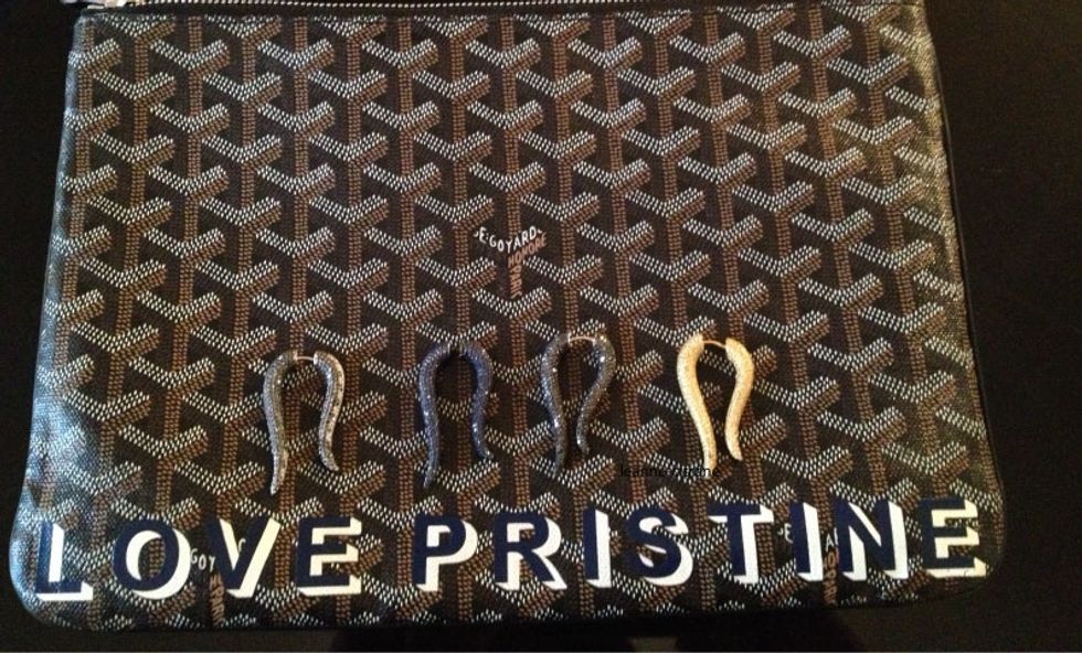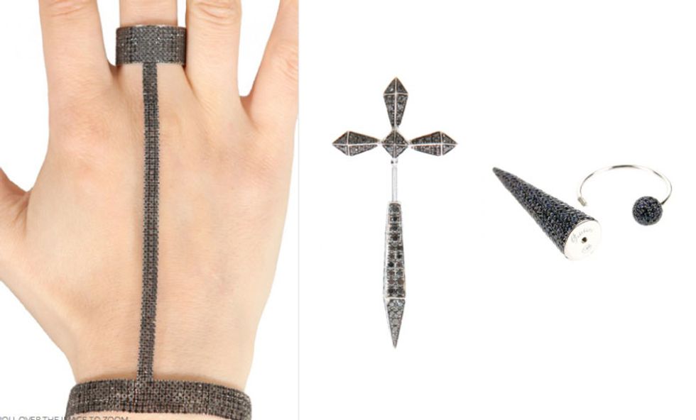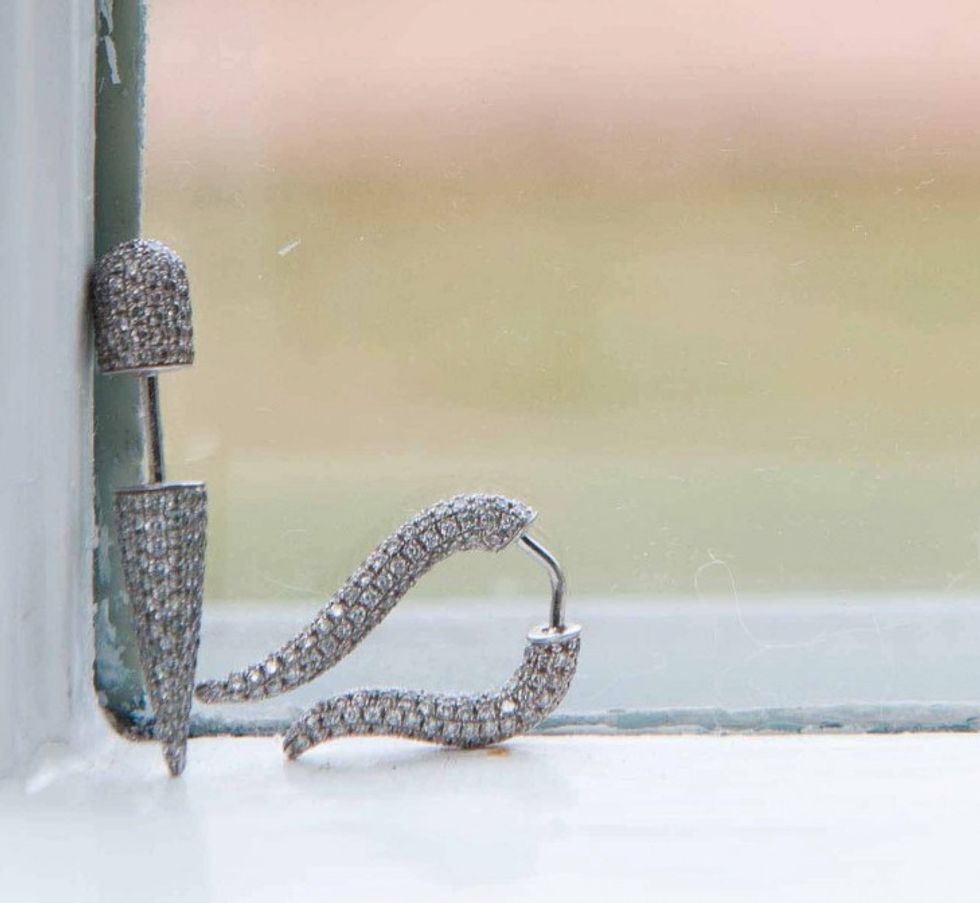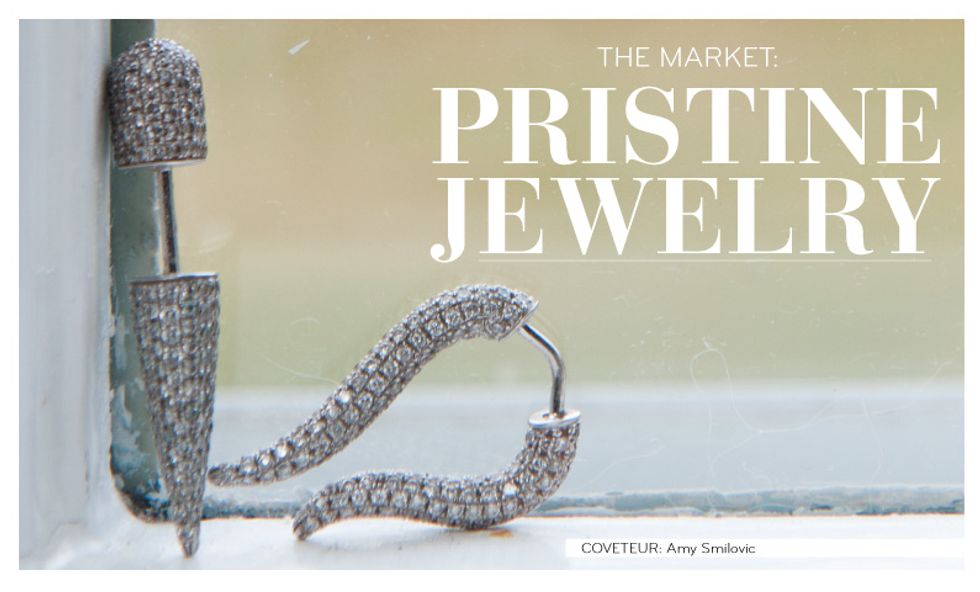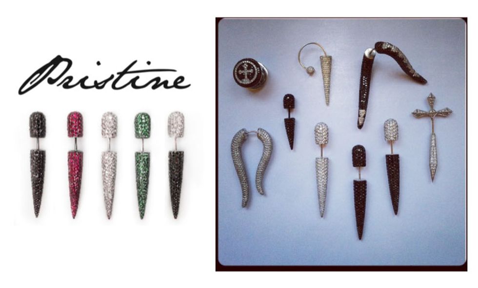 We first spotted Lauren Rubinski's pretty, punky Parisian line of bijoux, Pristine, while shooting the Courtin-Clarins girls at the Crosby Street Hotel. We took turns ooh-ing and aah-ing over their lobes, outfitted with diamond-studded spikes and imitation stretchers, working to create the ultimate tough/dainty dichotomy. After all, as we've been taking cues from Leandra Medine's recent shift towards a "deep liking for daintier jewelry," ditching our cocktail baubles in favor of skinny stackable rings, we're increasingly finding ourselves drawn to jewelry that captures that same balance.