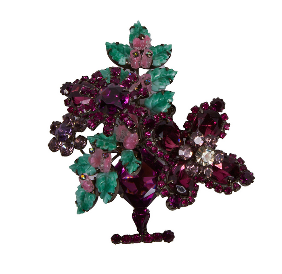 "Let me think… I'm trying to remember. I bought a wonderful pin recently; it's all pavé stones and must be about eight inches high. When you look at it at first it looks like a 19th century dandy. The gentleman has a long frock coat and interesting hat, like a top hat, but it's a trembling piece—its head wiggles. When you look more however, he's not a man, he's a monkey. He's really quite wonderful."