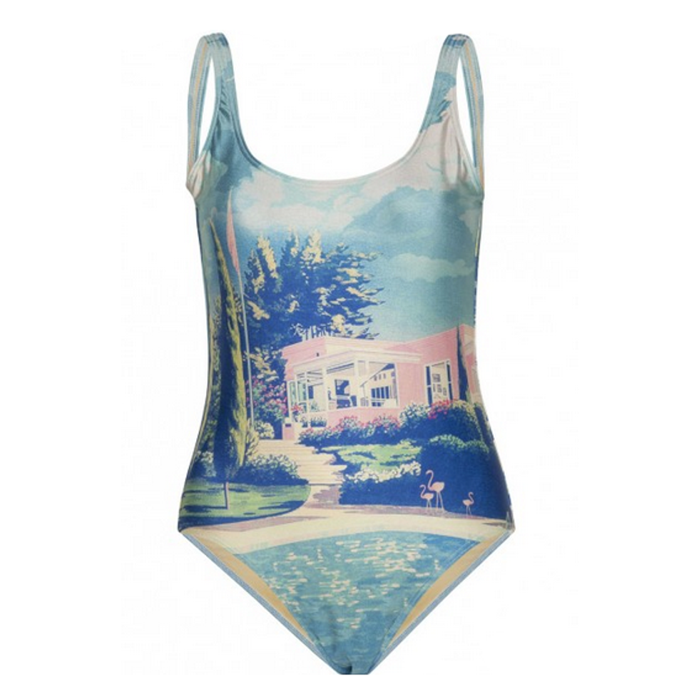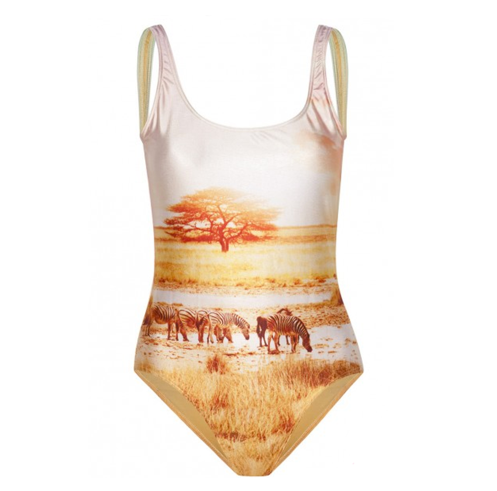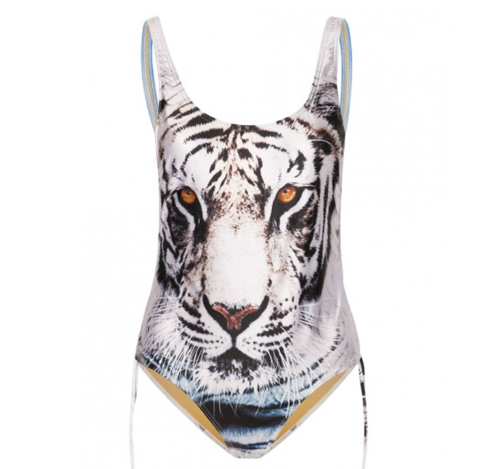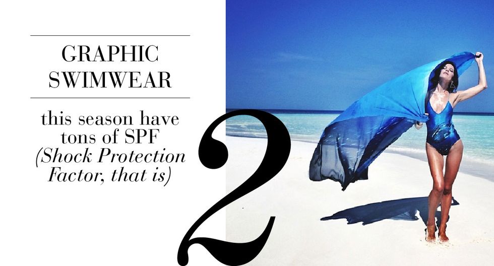 We’re the first to admit it: there’s a fine line between “printed” and “is that a girl or a tiger-printed sea creature?” But don’t let the jungle cat faces peering out from far too many a one-piece scare you away from graphic swimwear. The ones we’ve dragged into our shopping carts this season have tons of SPF (Shock Protection Factor, that is). Start out with a muted pastel ‘70s-style landscape or a more demure black-and-white print before venturing into full-on Miley territory.