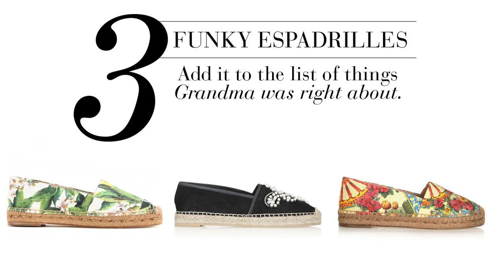 Formerly reserved for grandmothers and infants alike, feather-light footwear has now found middle ground in the form of the espadrille. We were hesitant at first, but now we’re full-fledged coverts—they’re just so damn comfortable. (Add it to the list of things Grandma was right about.) Pair printed brocade D&Gs with crêpe shorts or a sundress, or slip on a pearl-embellished pair to top off a work outfit—a.k.a. the answer to the unanswerable question, what the f@$% do I wear to the office in 90-degree weather.