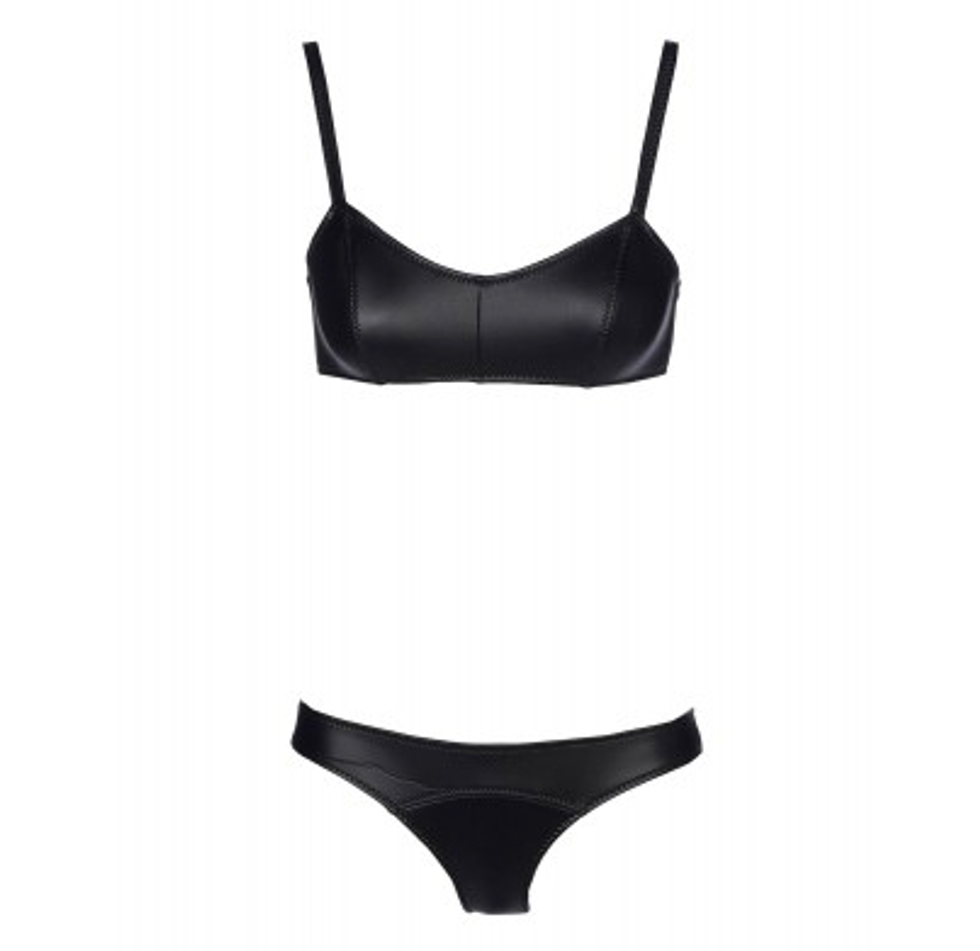 2. Our terry cloth poncho, which doubles as a towel worn over our Genevieve bikini in black rubber neoprene.