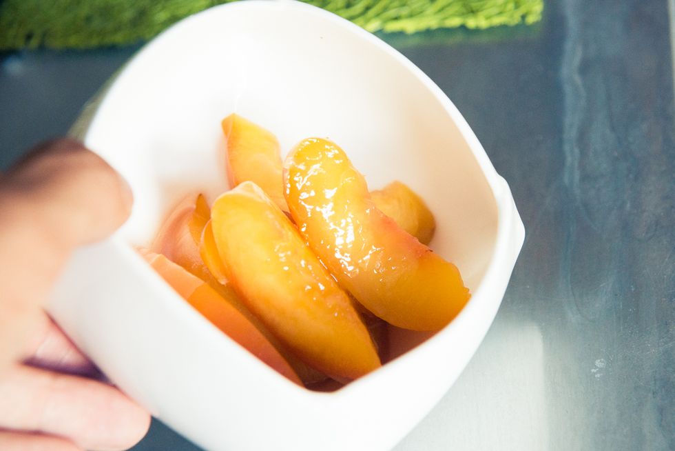 3. In a blender, blend together the peaches and melon skin, then sieve the mixture.