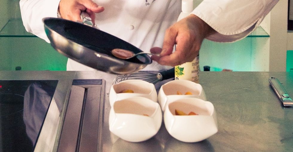 6. Spread the melon balls into verrines, pour from the blender and add a dash of hazelnut oil.