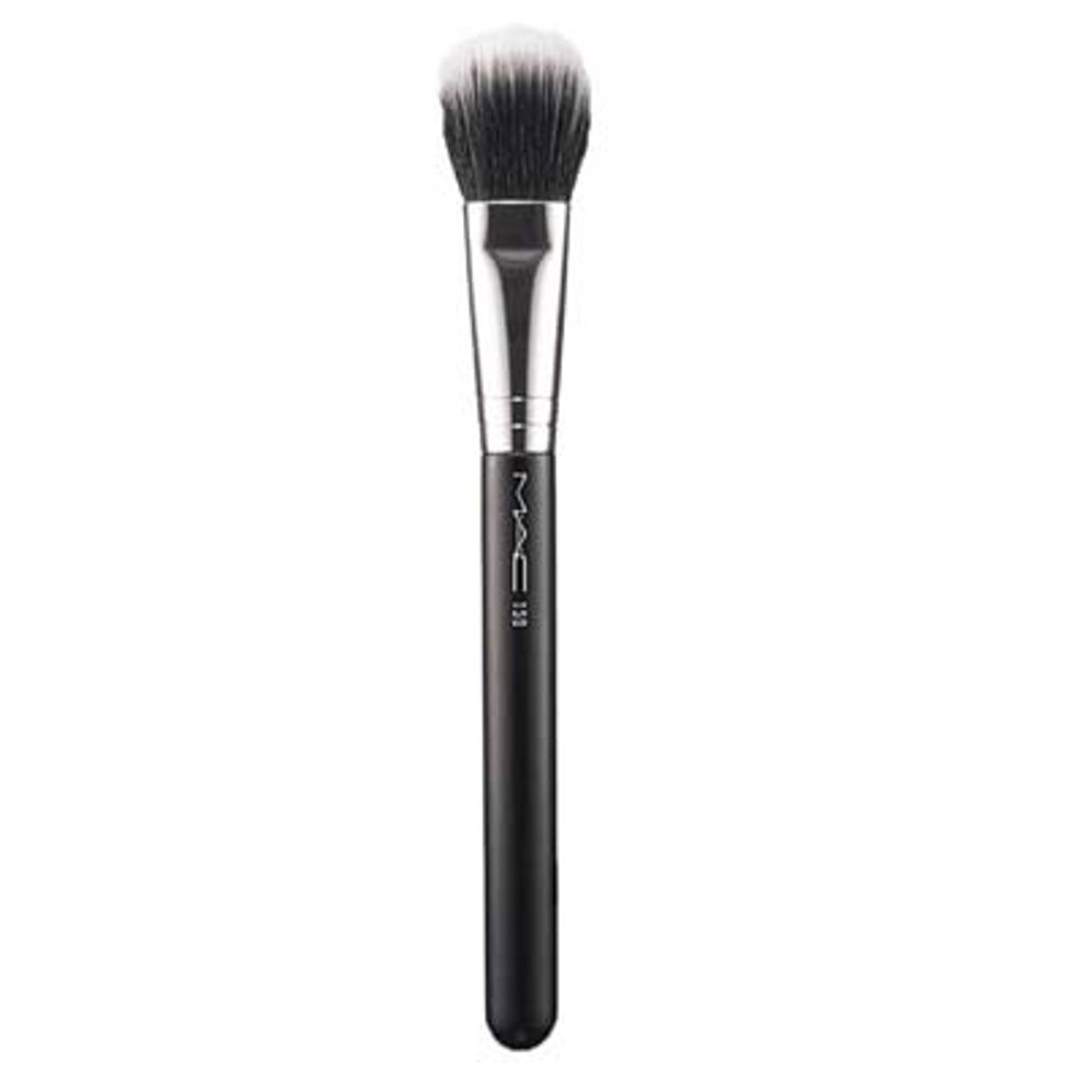 “1. MAC 159 Duofibre blush brush, but I use it for foundation. I like this brush because of its versatility; I can use it flat like a traditional flat foundation brush and brush the foundation on, I can buff the foundation using the ends of the fibers in small circular motions, and I can use a tapping motion to create coverage.“