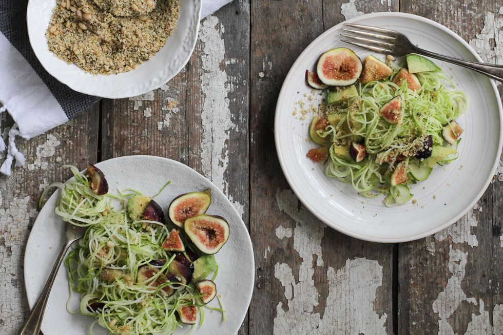 Lunch: Fig Zucchini Noodles with Hemp Seed Crumble and 3 ounces of the protein of your choice. OR take a large zucchini and shred with a food processor, a grater, or using a mandolin to create zucchini ribbons to use as 'pasta'. Top with fresh tomatoes, basil, and 3oz. protein of your choice.
