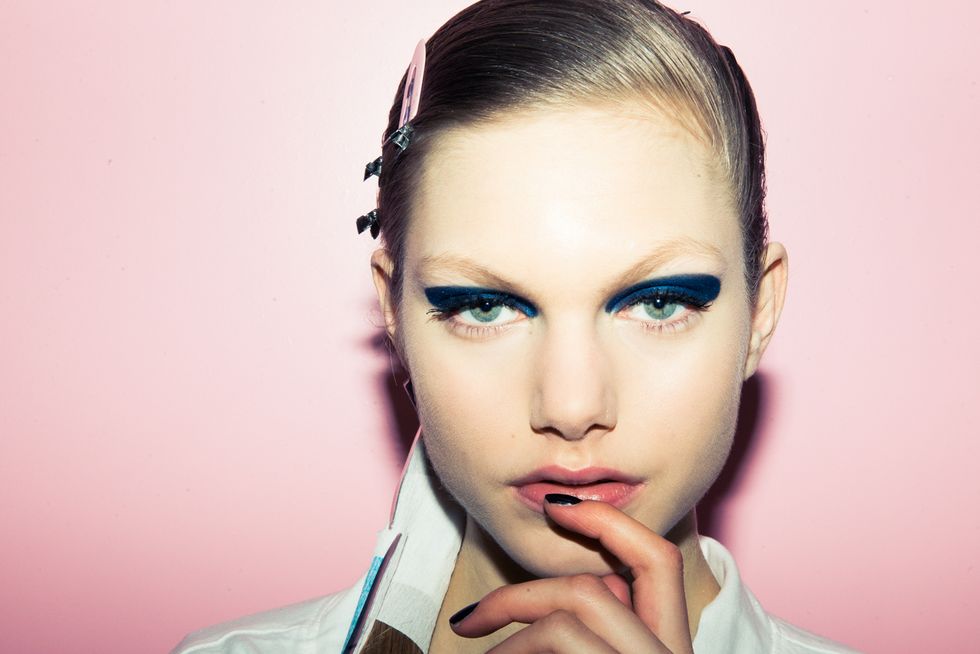 We know, we know. We’ve been preaching the whole bare-faced-and-bedhead look for a while now. But when Raf Simon’s psychedelic Dior parade trotted down the blush pink runway on Friday, we tripped. We mean, just look here. It was the above-the-neck ensemble — dramatic sweeping side-parted ponies, so sleek and shiny we could hardly look at them; the mani, dark and moody mismatched tips; the face, prim, clean and fresh, a cool contrast to the decidedly un-subtle glossy, graphic eye — that kicked in our eye shadow withdrawal. So naturally, we went to the source, Dior’s master face painter and Creative and Image Director, Peter Phillips, to see if we could pull it off IRL.