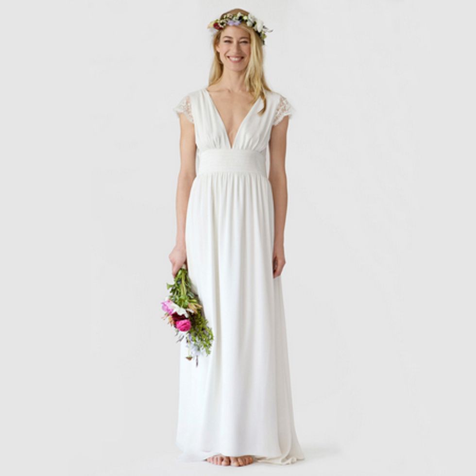 “I love our Glenda dress and our Frieda dress and our Caitlin dress… the silhouettes are universally flattering. They have a knit cumberband waist, long sleeves and full flowy skirts. They work on a lot of body types—for big boobs, small boobs, petite, curvy. I love the long sleeve, so chic—a really long lace sleeve. If you are going to do it, make sure it’s not too tight in the arms. The last thing you want is for sleeves to be too tight.”
