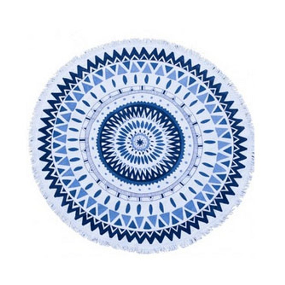 A fun and printed bather is a yes because the rest of my wardrobe is black. And I love this round towel—it's like a hybrid between a beach towel and a blanket. And I gotta tell you—I'm a sucker for a swinging lounger. I can just imagine myself in a summer dress reading a Jane Austin novel and falling asleep to the rustle of the willow trees in this hammock. Am I right? Dreamy Summer Friday.