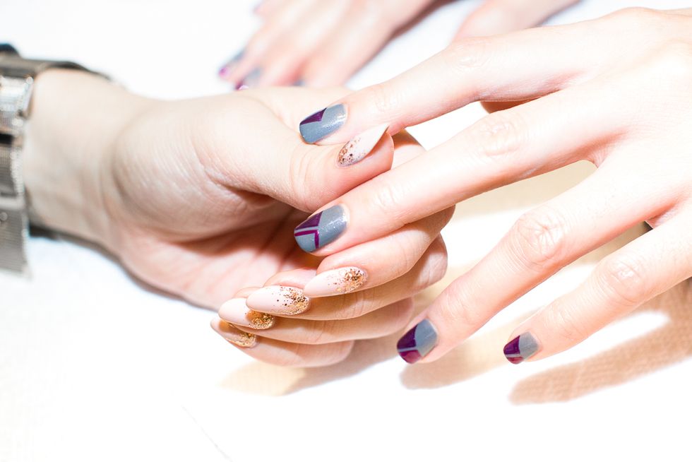 If you're guilty of any of the above, we'd like to welcome you to Jin Soon Choi's manicure rehab: wherein one of the salon's talented manicurists, Reiko (who sported a seriously enviable mani herself—check those glittery tips!), broke down for us exactly how to mix things up, DIY-style. Turns out adding graphic lines and shapes to your tips is about a billion times easier than anyone imagined—zero dubious Pinterest hacks needed.