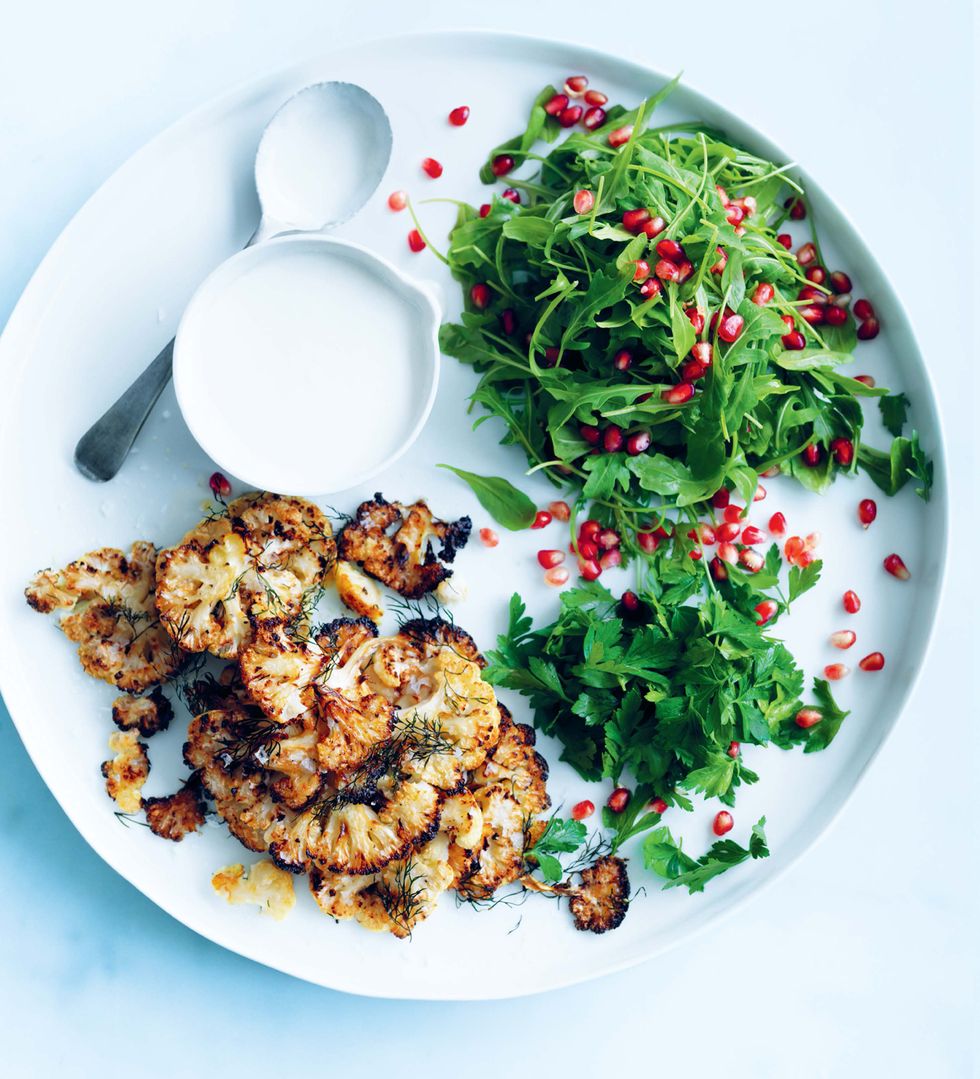 FOUR >> Arrange the cauliflower, rocket and parsley on a serving platter and sprinkle with the pomegranate seeds. Serve with the tahini dressing.
