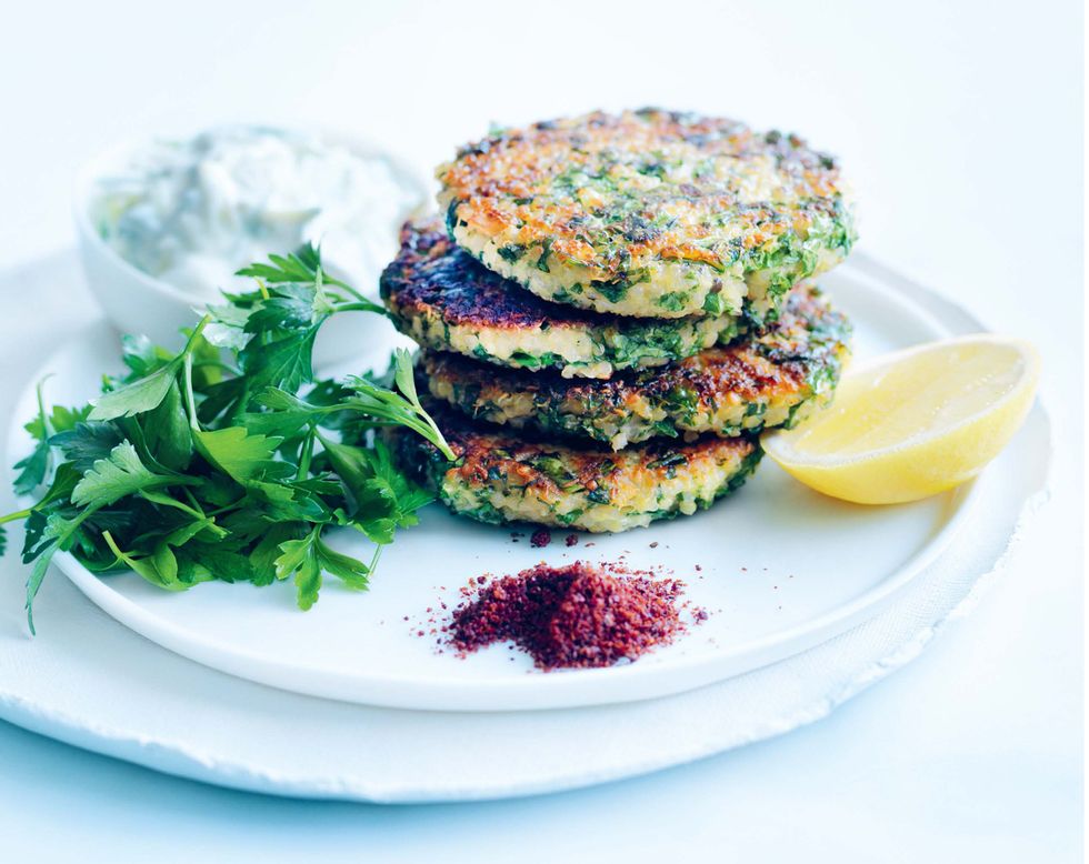 SIX >> Divide the fritters between plates and serve with the tzatziki, parsley, sumac and lemon wedges.