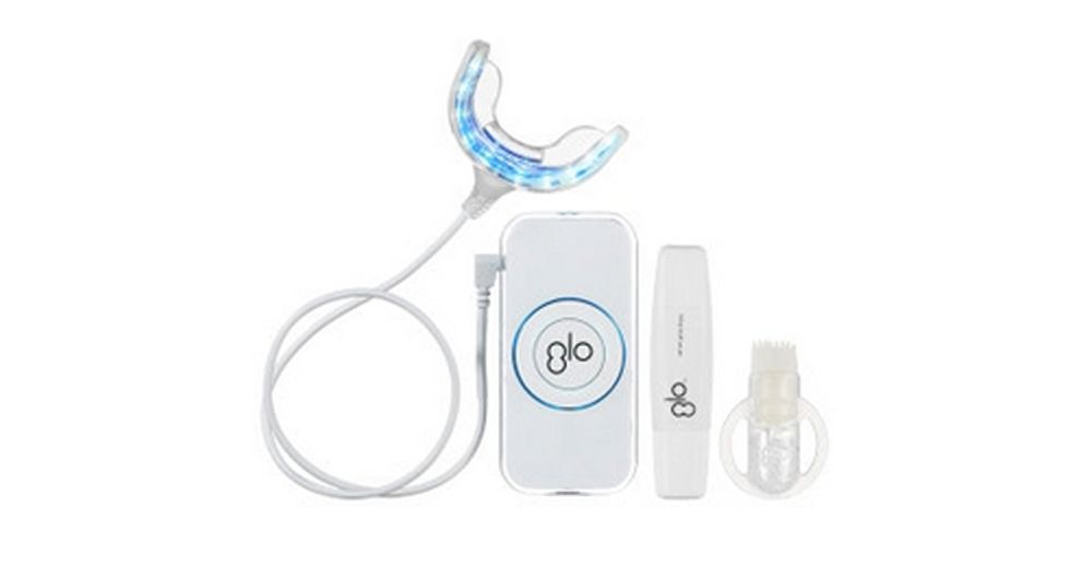 The GLO Brilliant method is three-prong. First, you prepare your lips by applying GLO Lip Care. Then, you squeeze a small amount of teeth whitening gel onto the fronts of your top and bottom teeth. Pop the mouthpiece in your mouth, press the “GLO” button on the control console (reminiscent of an early-era iPod shuffle) and get comfortable for the next eight minutes. Once complete, you can do up to three more sessions for noticeably whiter choppers before the day’s end.