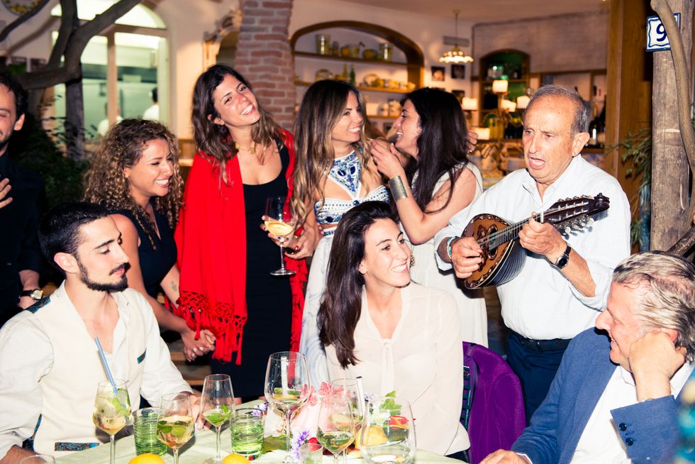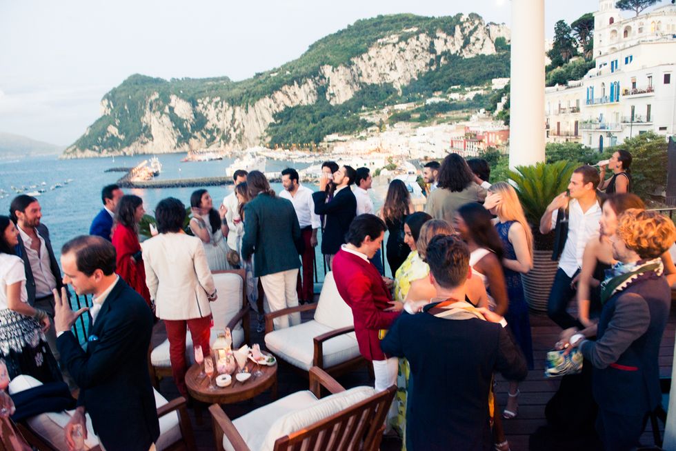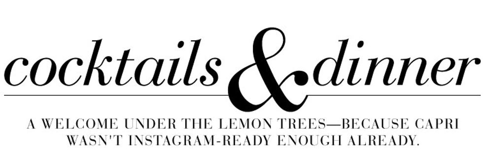 Fast forward two flights, two trains, one cab ride and two ferry rides (phew!) direct from Ibiza later to our arrival to JK Place in Capri. Let’s just say that if this is what wedding locales have the potential to look like, than we’ve already joined the league plotting theirs out via Pinterest, actual to-be partner in marital bliss or not. Shortly after settling in, we joined the guest procession slowly spilling out onto the hotel's terrace, overlooking the beach and harbor below, reuniting with Cov-alums like Brian Atwood, Mary Katrantzou and Cameron Silver before heading down a winding cobblestone road for dinner at the famous Da Paolino. With the restaurant's famed lemon trees dangling just overhead, and the entire wedding party gathered beneath at a lengthy communal table (the groom-to-be explained his affinity for family-style dining over isolating guests via separate tables—sweet, right?), we ate, drank (and drank... when in, er, Capri, right?) and were merry, to put it lightly. And while we solemnly swear we had every intention of turning in early before the big day, when a crew like this asks you to head out dancing at the Amena e Core into the wee hours, you don't exactly say no.