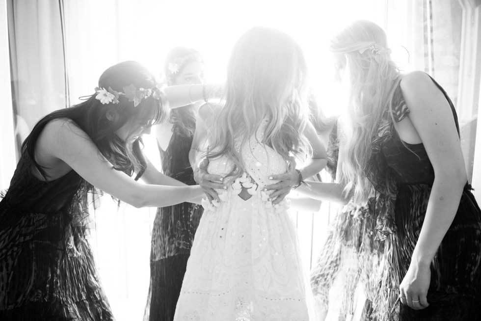 Back in the couple's massive suite, we popped champagne with Pelosini and her bridal party as they sat in hair and make-up and bonded with Mr. Pelosini (that would be Erica's dad, duh). Fake lashes on and just-ironed 'woke-up-like-this' waves intact, a team of seamstresses made their way through the room, sewing each and every bridesmaid into their sea blue Pucci before arriving at Pelosini with her one-of-a-kind, custom Peter Dundas creation. Ever the master of over packing, Pelosini finally settled on a pair of lace-up (and again, custom, because when you have a good thing going...) Aquazzura sandals before we headed off to the ceremony. (To illustrate exactly how laidback Pelosini was about the entire afternoon—her planner assigned us the task of ensuring that the bride arrive at her final destination in a punctual fashion, rather than her preferred 'Erica time.')