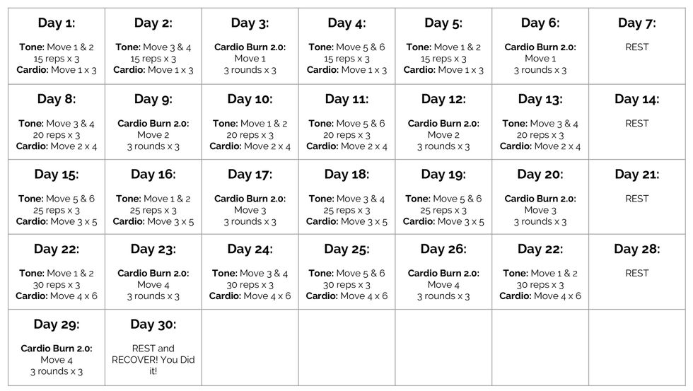 Each day you will complete 2 tone moves followed by that week’s cardio ‘burn out’ move. On the days marked Cardio Burn 2.0 it’s a cardio only day.