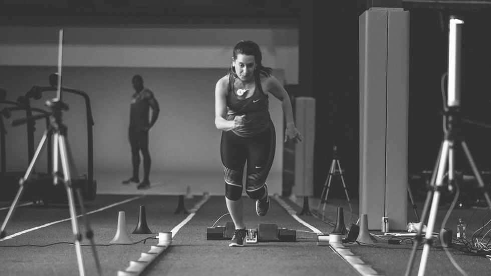 Maybe it was my complete lack of knowledge of what “athletic performance testing” was—heck, I didn’t even know there was such a thing (just me?)—but this shit was scientific. Think 3D foot scans, sensors to track your frontal cortex activity, lasers to measure everything from stride length to speed to amount of pressure used throughout different parts of your feet for take-off from the block start. Crazy stuff. Then there was something called an FMS and Y-Balance Assessment, which consisted of lots of peering eyes (did I mention there was a ratio of like five MJP coaches to one editor?)—although I have to say, they weren’t judgmental; if they were, they were good at hiding it—looking me up-and-down, trying to spot any imbalances or dysfunctionalities in my movements. There were also slow-motion cameras to catch anything that naked eye couldn’t see. See what I mean about things getting intense?