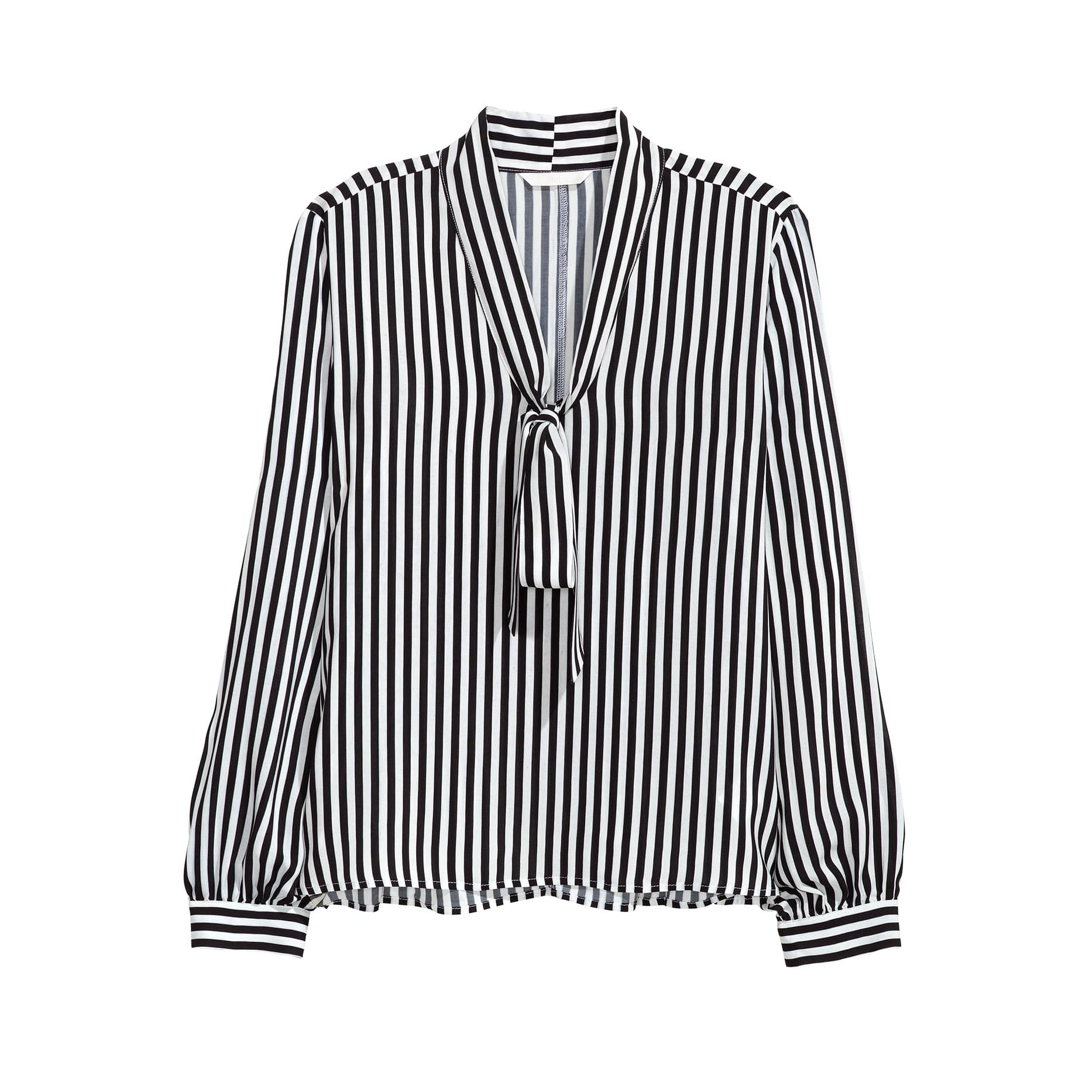 1. Striped tie blouse: This is pretty much the perfect shirt to tuck into a denim skirt now and high-waisted mom jeans of flares later.