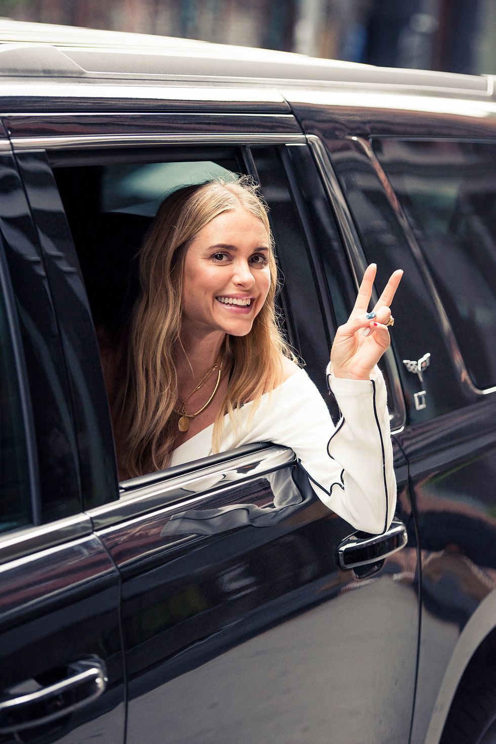 Teisbaek is one of our favorites every season, largely because she manages to strike all the right notes—take the flowy off-the-shoulder blouse she expertly mixed with a pair of timeless skinny Levi’s (their 711s, to be exact), a pair of ultra-ladylike The Row sandals, and a geometric Loewe bag.