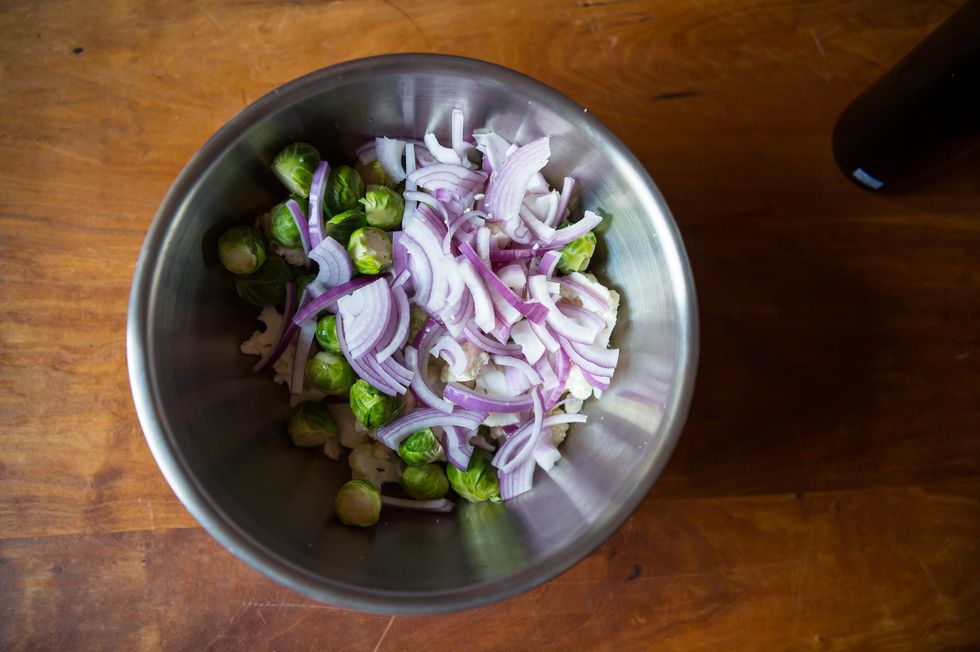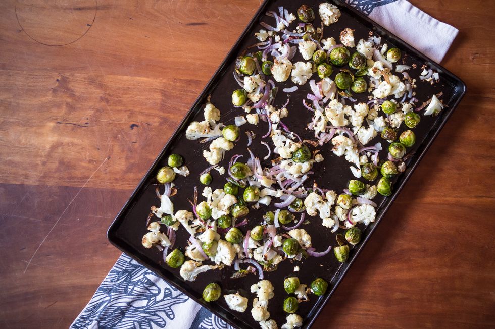 3. In a mixing bowl, toss the trimmed brussels sprouts, cauliflower florets and sliced onion with 2 tablespoons of olive oil (or enough to lightly coat the vegetables), a pinch of salt and some ground black pepper. Spread the vegetables on a rimmed baking sheet (it can be lined with parchment paper if you’re organized like that, or go commando if you’re bold) and roast for 18-20 minutes or until softened and slightly golden, mixing them around with a wooden spoon after 10 minutes.