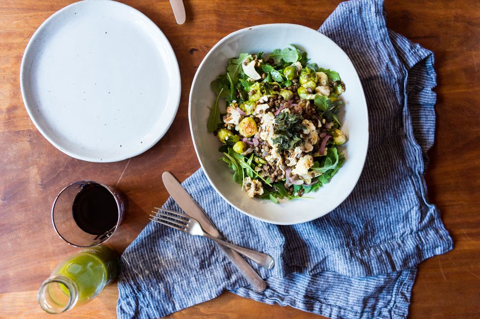 6. Combine your roasted vegetables with the lentils, and toss in vinaigrette until just coated.