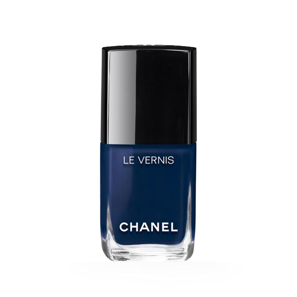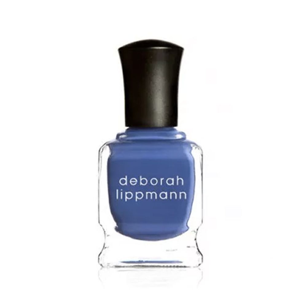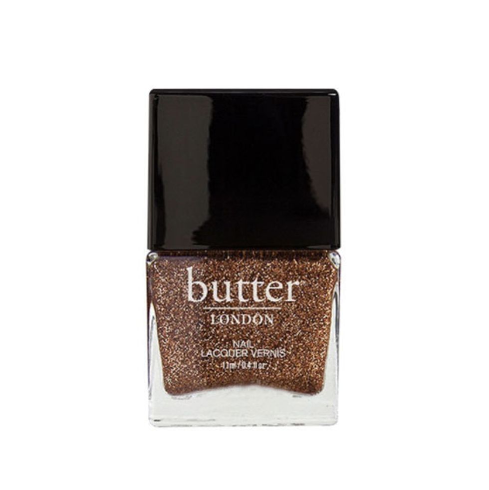 “Start with base coat, then add two coats of blue polish. Next, use a striping brush or brush from the bottle to paint sideways across the nail to create a straight line, then fill in the empty space with the bronze glitter. Do this on each nail, finish with top coat.”