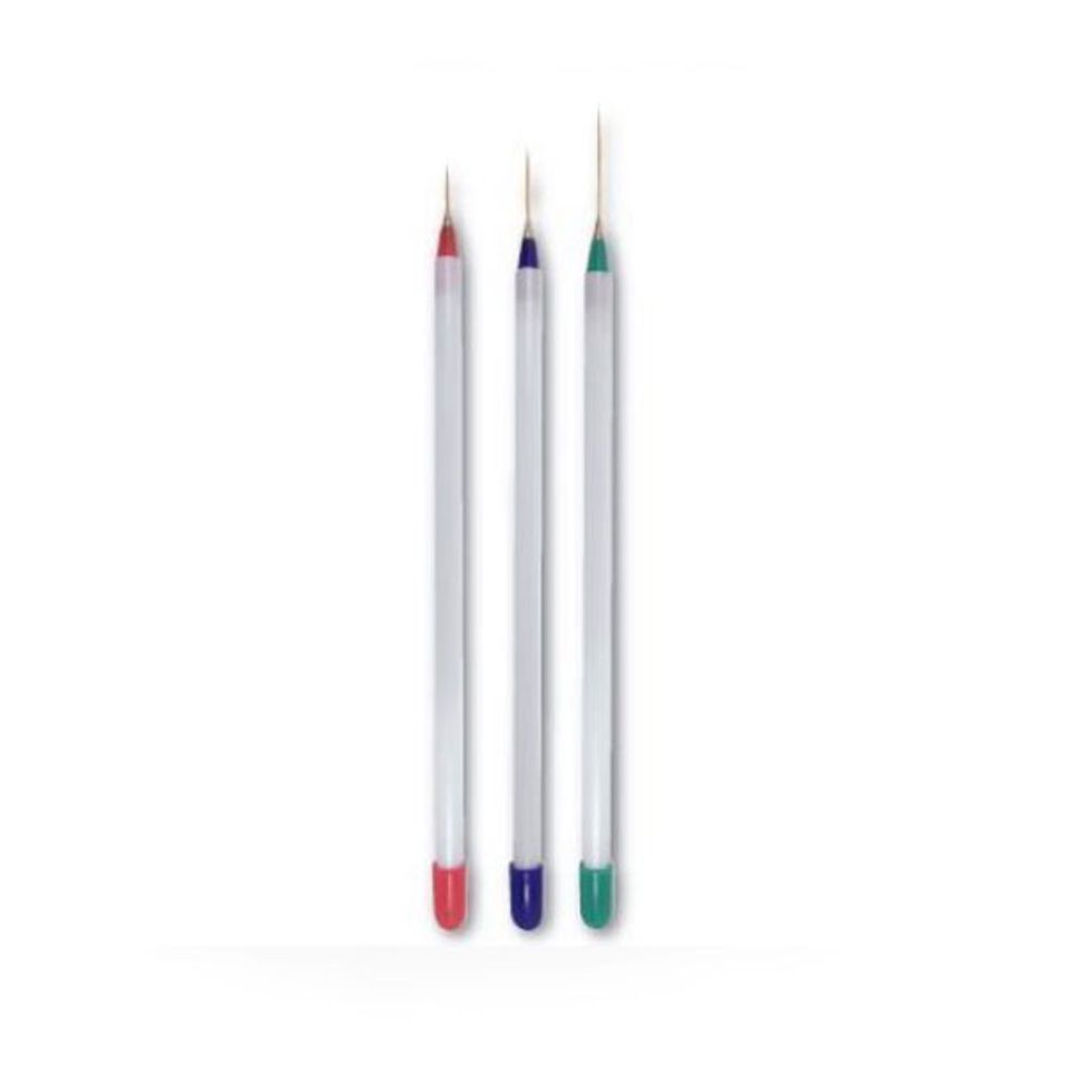 “Start with two coats of a base coat in a solid color. Use a striping brush to create the French shape at the tips with a contrasting metallic color. Finish with top coat.”
