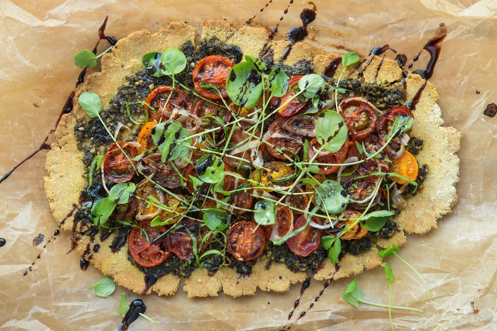 “This flatbread is made of chickpea flour in the style of classic Italian farinata or French socca for an elevated, nutrient-dense pizza experience. Chickpea flour is naturally gluten-free and rich in protein and fiber, FYI. We’ve smeared ours with fresh pesto and garnished it with heirloom cherry tomatoes and shallots, but feel free to substitute with the toppings of your choice. Serve slices as hors d’oeuvres, or consume as the protein-rich prequel to a night with your Netflix queue.”