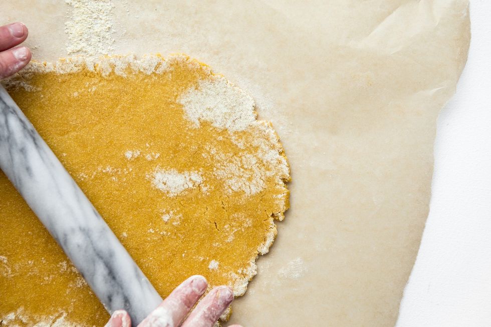 5. Cut dough in half and roll out on a layer of waxed paper dusted with flour.