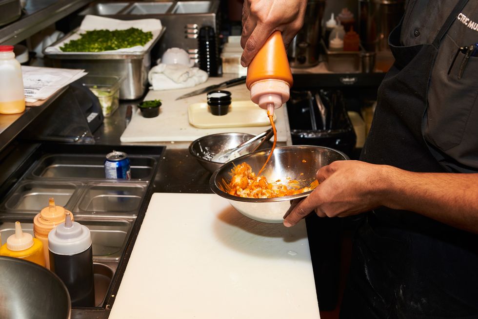 3. Put into a bowl and mix with salt and buffalo sauce.