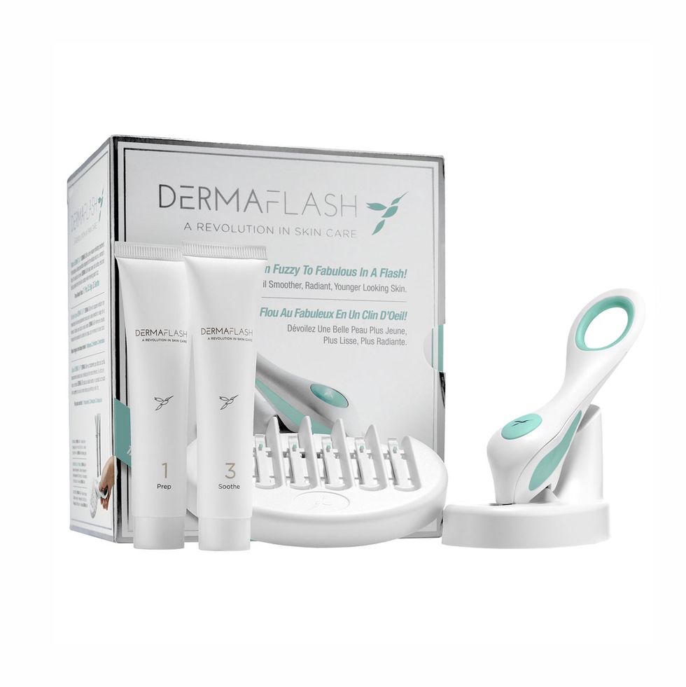 “One of my secret weapons is Dermaflash. It’s the first at-home device that gives you superior exfoliation equivalent as going to a derm or an esthetician. I do it a lot. What it’s going to do is take off the peach fuzz, but it also sloughs off the dead skin.
