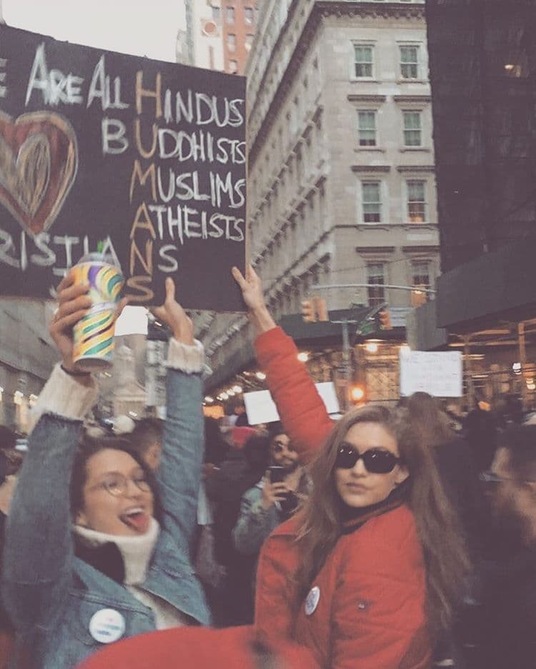 The stylish Hadid sisters traded the runway for an NYC march on Sunday, protesting the refugee ban side by side. Their sign—which read “We are all Hindus, Buddhists, Muslims, Atheists, Christians, Jews” and connected to spell “HUMAN”—was personal: their dad is Jordanian-American and Muslim, while Gigi's boyfriend, Zayn, is Muslim as well.