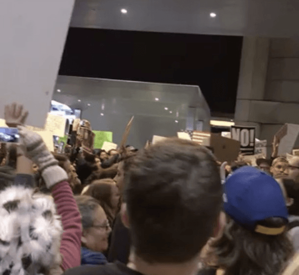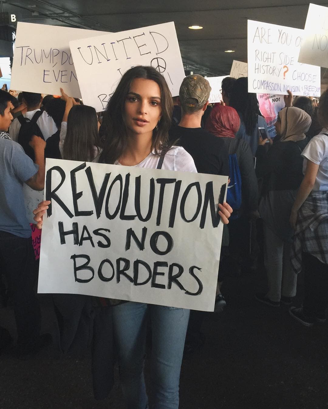 Emily Ratajkowski snapped a photo while standing in a crowd at LAX, captioning her post “Power to the people #NoBanNoWall.”