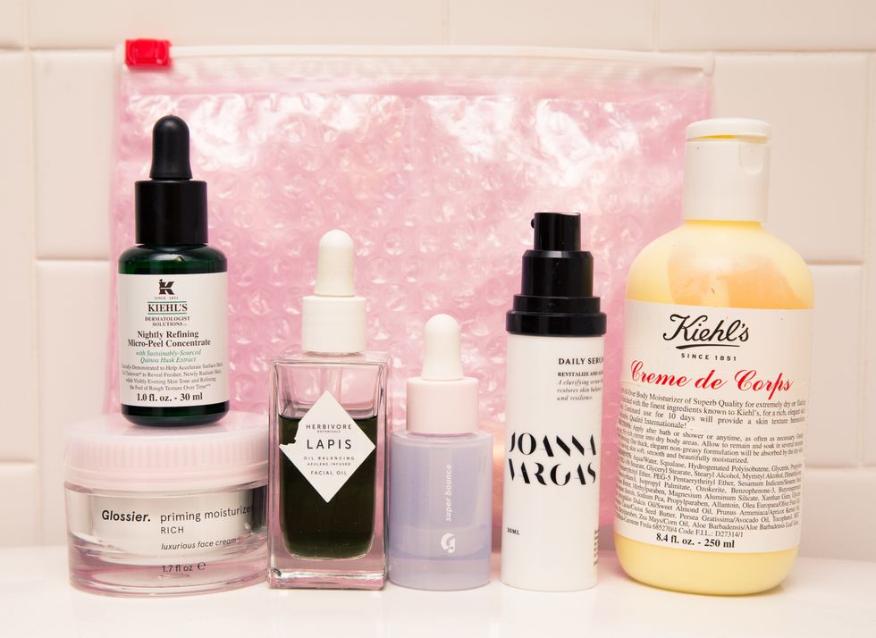 “I switch off between a night and a morning cleanser. You can obviously mix brands, but I stick to three or four brands at one time because the way that their products are formulated, they’re meant to work together. I’m also a huge mask person—I use a lot of the Kiehl’s masks, I obviously use a lot of the Glossier masks. I love Joanna Vargas and all of her products. I try to mix it up a lot as well, because the weather in Manhattan is always changing, so it’s really based on how my skin feels and customizing my routine from there.”