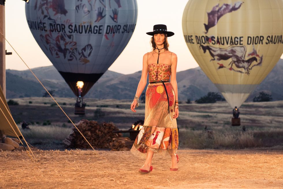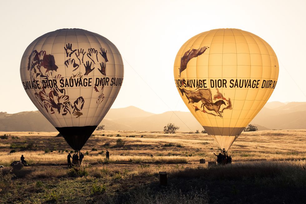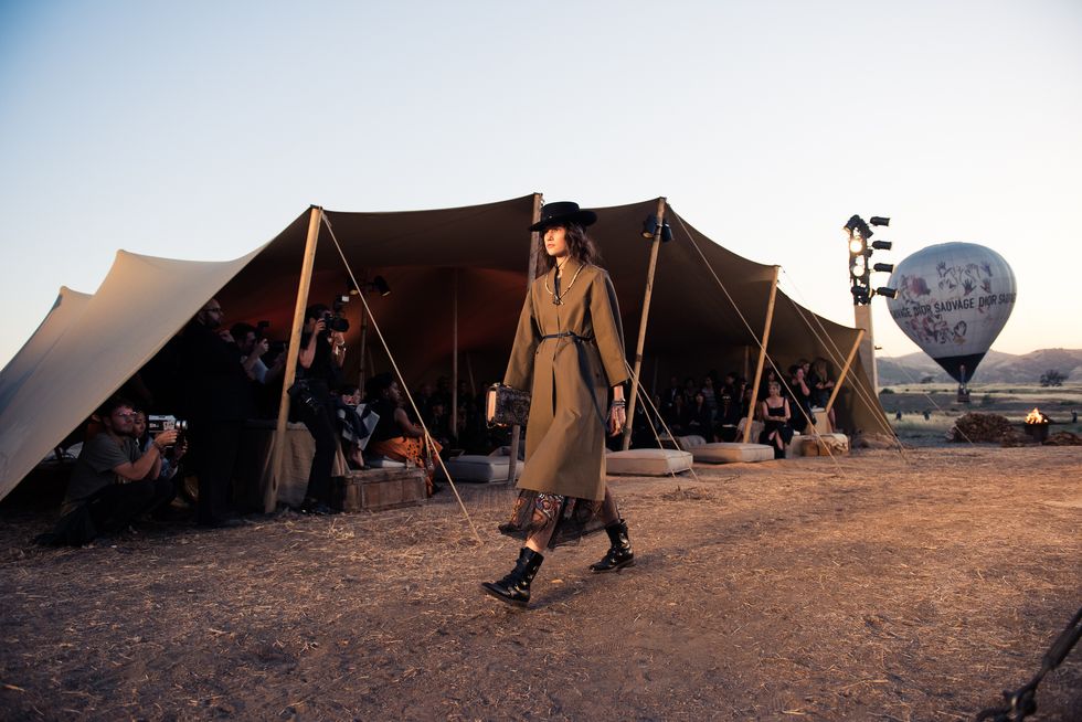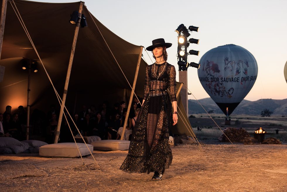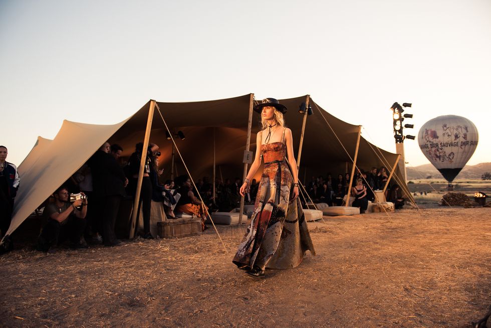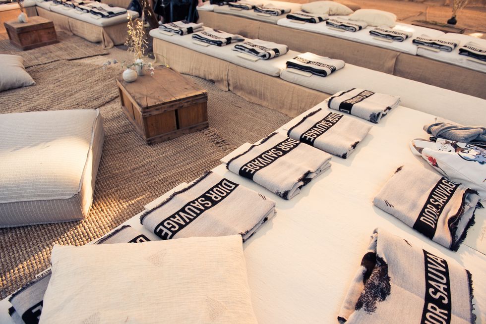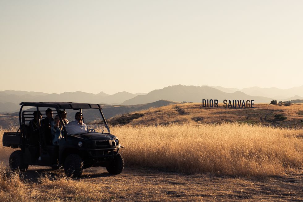 After getting up the mountain, guests were whisked away in ATVs and brought into a stunning space created with tents, pillows, and stone set against the setting sun with two large Dior Sauvage hot-air balloons ready to take flight. While we were in L.A., it felt more like we were in a remote ranch outside Santa Fe.