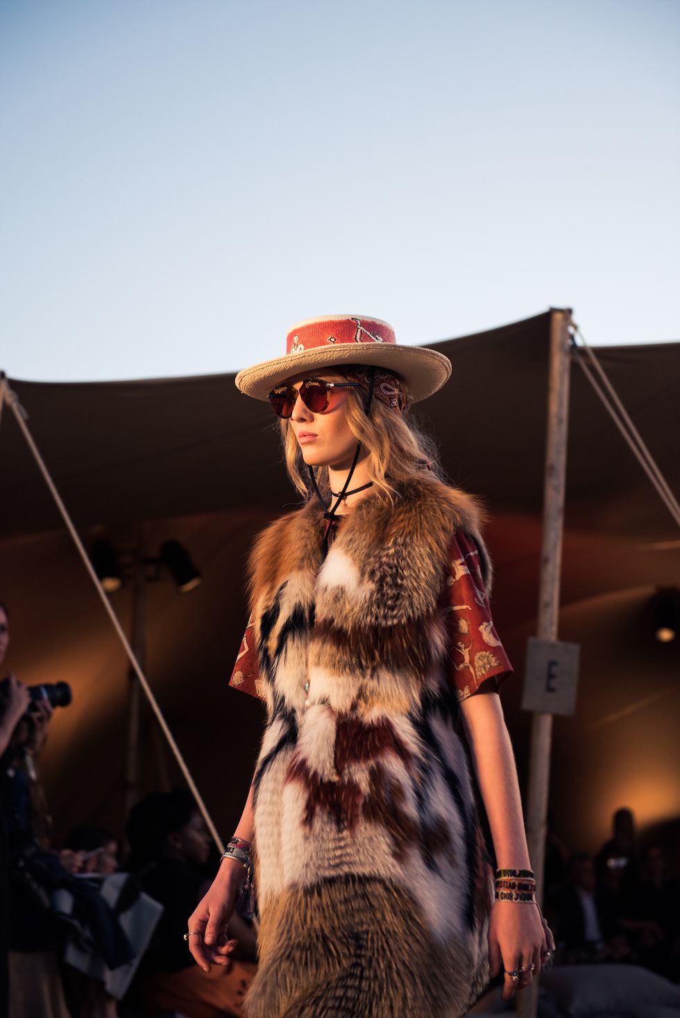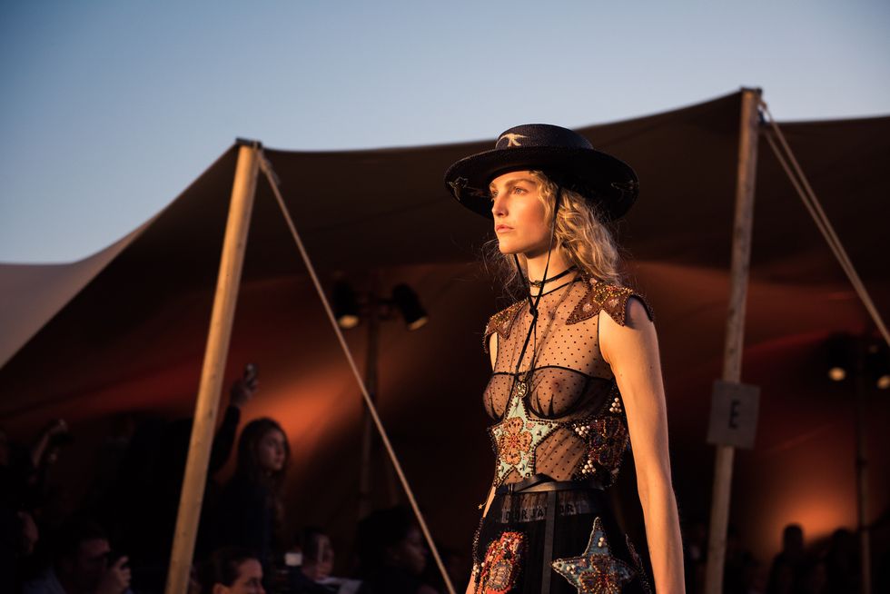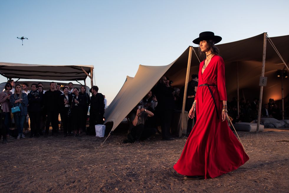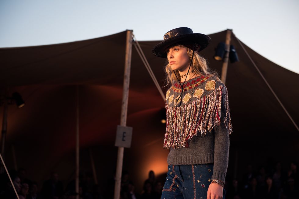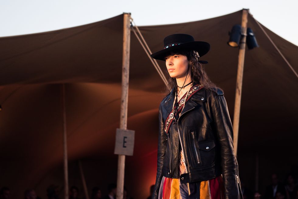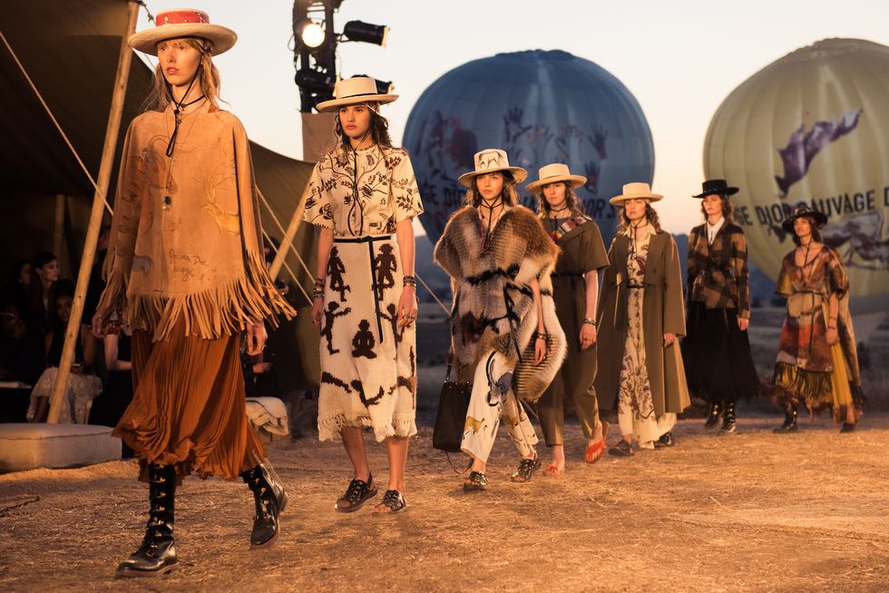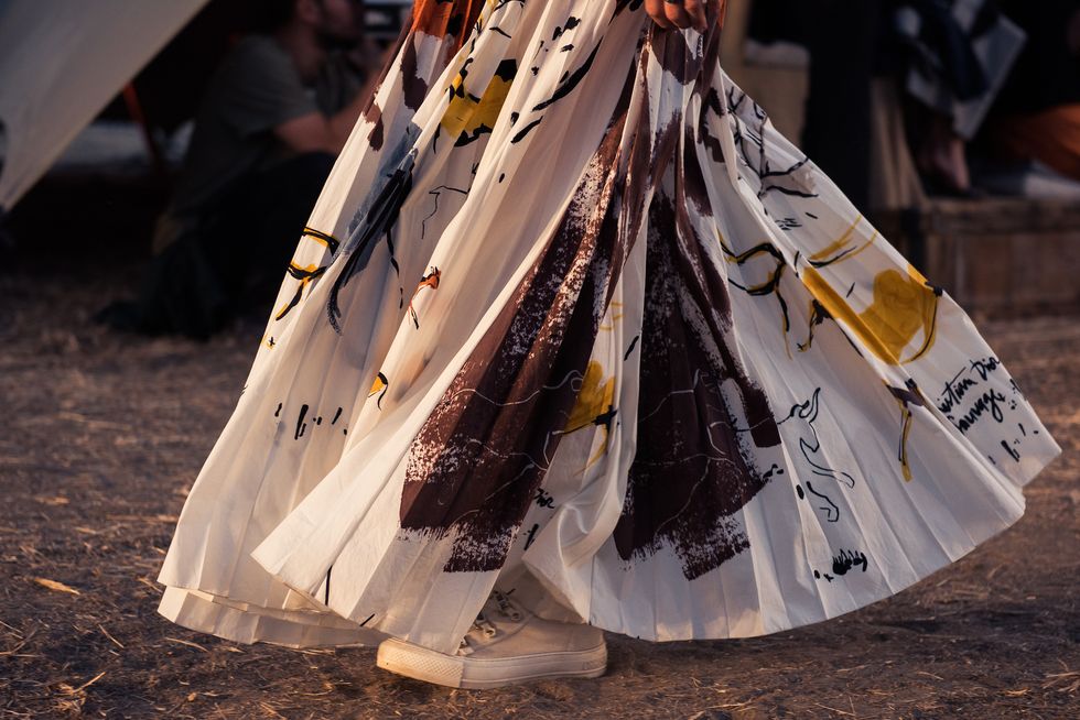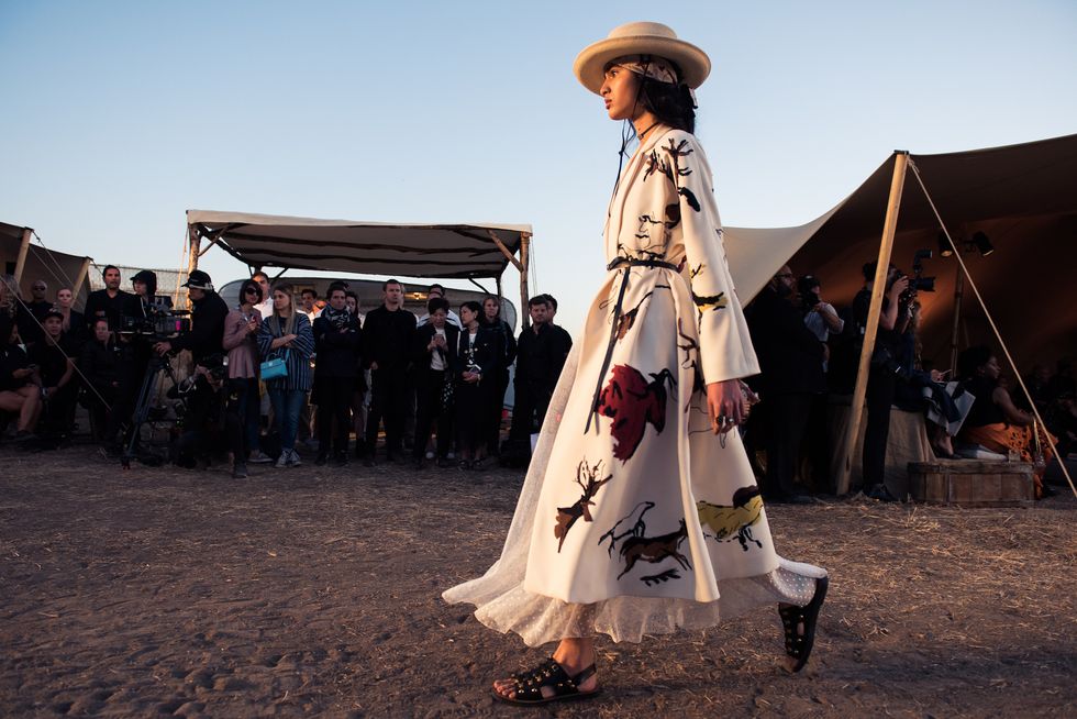 The looks that Chiuri sent down the runway were a perfect extension of the mood set. References included the designer’s favorite book, Women Who Run With Wolves, Christian Dior’s use of rock paintings by Georges Bataille, and the relationship between woman and nature. Grazia built upon her already successful silhouettes for the house by using new and heavier fabrics, heavy flat sandals, and hand-painted details. Fringe, ponchos, and flat top hats created the image of a strong yet sensual woman. How perfect, considering Rihanna was front row and Solange performed. Strong women indeed.